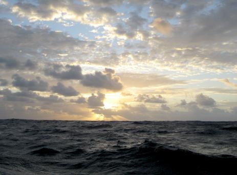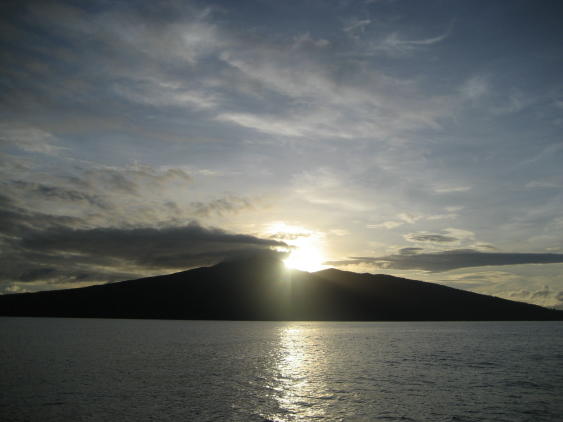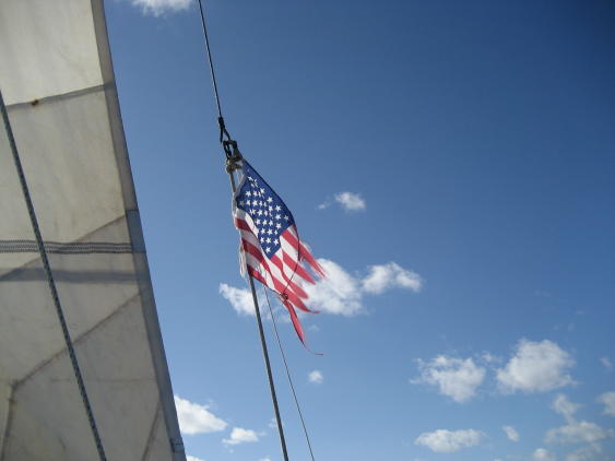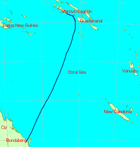 No, this isn't a shot of Oz. As usual, we begin our passage with a parting shot, this one being a sunrise over the lovely Solomon Island of Nggatokae. After pondering how to get to Bundaberg, Australia from the Solomons, we decided we'd have to head east a ways in order to have a reasonable angle to the wind, known to sailors as a good "point of sail". So, we left from Marovo Lagoon and motored east until we arrived at Guadalcanal then headed south. We had paid a weather router to advise us on when to leave; we should have saved our money. We were told we'd have a day or two of gale-force winds owing to a "squash zone" between the tropics and a high pressure area just departing the Australian coast into the Tasman Sea. We ended up having 5 such days. Our wind instrument being broken, we could only estimate wind speed from the noise, but we can attest that when the wind reaches gale force (34 knots) it gets very noisy in a unique way. Very noisy. We also had breaking seas of 3-4m (9-12') which pounded the hull and washed over the deck, showing us new and exciting leaks. We finally retreated to living below decks, crawling along at 2-3 knots into the crashing waves. No fun. This is Old Glory after 5 days of winds to 40 knots. The flag looked fine when we started. For readers who wonder why we didn't take it down, what you can't see is that the line used to raise it is broken and the only way to retrieve it would have been to drop the rigging it's attached to - not feasible in a gale. The other tidbit probably surprising to landlubbers is that the sky can be clear and sunny and still it blows like hell - for days. Sometimes you just crawl into a hole and hope nothing breaks before it eases. One thing that did break was the staysail. First the hanks, brass hooks used to hold the sail onto the forestay, started breaking, then the shackle on the halyard came loose, causing the halyard to fly up to the sheave (pulley) high on the mast. Climb up there in 3-4m seas? No way. So, you improvise, letting out just a little bit of main jib so it will sail in a balanced way. Then you crawl back into your hole. Anyway, like the rest of our "adventures" we survived to tell the tale. Join us as well begin our time in Australia.
