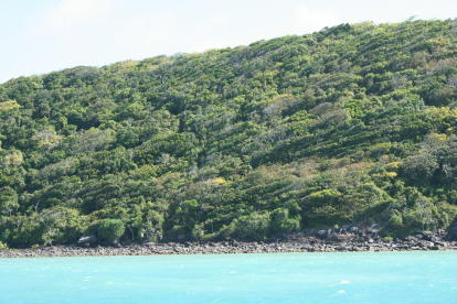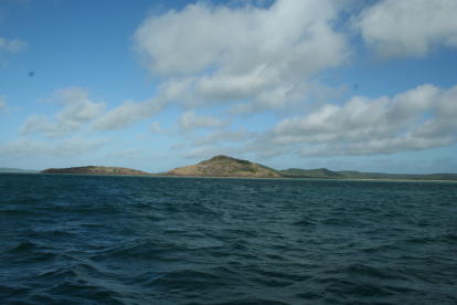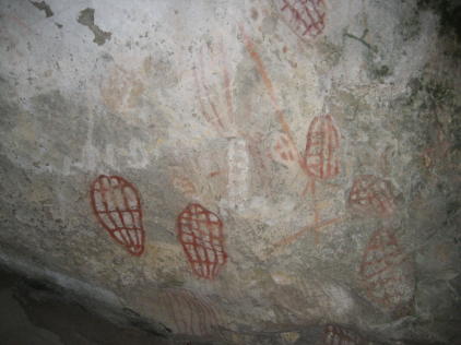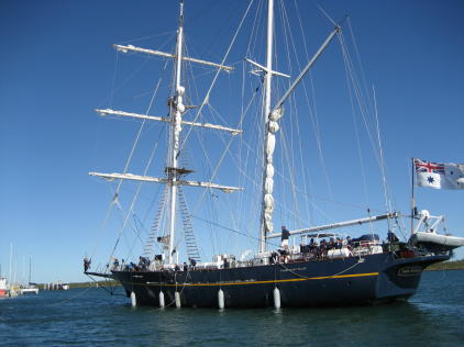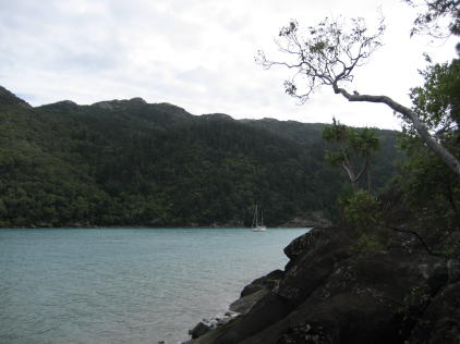 (click on a place to go there) Without reference to a map, the idea of sailing from Bundaberg to Darwin may sound easy, but it's not. It's close to 2,000 miles and much of it is best done during the day. That's because half the route is inside the Great Barrier Reef, which is strewn with islands, reefs and container ships moving at 20 knots between them. So, we had to do some actual planning. As you can see, there's a lot of stops until one passes Cape York, at which point one is pummeled by the sea. For days. Badly. Only someone needing to make the same passage or a sailing nerd would really care about the places enumerated above. However, for completeness we will mention that the stops, mostly islands, were: Great Keppel I ,Rosslyn Bay,Pearl Bay,South Percy I, Scawfell I,Hook I,Orpheus I,Kent I,Cairns,Low I,Hope I,Flattery Bay,Flinders I,Morris I,Portland Roads,Margaret Bay,Escape River, Simpson Bay, Alcora Bay, Darwin (whew!). It took about a month of almost daily movement. The only longer stops were in Rosslyn Bay to replace $1800 worth of batteries,Hook Island in the Whitsundays owing to a gale and Cairns because our desalinization system broke down. It was a forced march, er, sail. As we were leaving Bundaberg, the Oz Navy training vessel Young Endeavour was docking. It's an interesting mixture of old and new, e.g. the headsails are roller-furling. A bad omen when we left was the engine did not want to start. This was the symptom of bad batteries that finally forced us to pony up big bucks for all new ones. Batteries that cost us $80 in Trinidad were $240 in Rosslyn Bay, but we had no choice but to pay. We had always wanted to visit the fabled Whitsunday Islands. Of course, we had to be there during a gale. But. we were well-hidden in the Nara Inlet on Hook Island, as the tub-shot above attests. One interesting feature of Hook Island are the Aboriginal cave paintings. No one knows what the drawings mean, but we've ruled out snowshoes and tennis rackets.