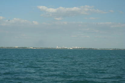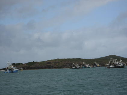 One thing we did do was catch fish. Here Capt Hub holds his latest victim, a Yellowfin tuna. He (Hub) has obviously been eating more than fresh fish. Constant companions on the east coast of Queensland are prawn (shrimp) trawlers. They fish by night and sleep by day, as seen here in the Low Isles. And Margaret Bay. The reader may wonder why we have not regaled them with more shots of the beautiful Coral Coast. This is partly because we tended to leave and arrive places in the dark or dawn/dusk, also because it gets very hazy here owing to the strong trade winds. This is a great cruising ground for the financially gifted, but has 3 major drawbacks: crocs, crocs and crocs. They can grow to 7m and weigh 1/2 ton. They are patient hunters and will stake out anyplace you frequent and strike without warning. The admiral admits to being allergic to crocs, so we have never tested the waters here. We were also under a lot of time-pressure to get to Darwin and one never knows when the weather will become untenable, perhaps for as long as a week. So, we had to keep moving. This is when you know you're close to the "top" of Australia: Albany Pass, an inside section of the Torres Strait. The tidal currents here rip at up to 5 knots, which is a lot for a sailboat. One must therefore begin to consider the tides as one leaves the Pacific and enters the Indian Ocean. Did we mention strong trade winds? The trees in Albany Pass appear to be combed: they are actually sculpted by the trades here which can blow at gale force for weeks. Every yachtie has their Cape York shot, the top of Australia. This is ours. The pyramid-shape is actually Cape York Island, the Cape itself is behind it. After the Cape we spent the night at Simpson Bay because we were advised not to attempt Endeavour Strait at night. After that we had a seeming eternity crossing the Gulf of Carpentaria which is rather shallow and thus capable of nasty seas. This is Darwin. As we got within 20 miles of the fabled city the exhaust on the engine blew out whilst we were happily motoring. A temporary repair was effected using a cut-up soup can and hose clamps. However, we feared to run at anything above idle so we limped slowly into Fannie Bay and a chance to catch up on our sleep, which had been rather short for the previous week. Now the challenge is to obtain all the parts needed and repair all the stuff that broke on the way up here. This is most critical, since we will be leaving the first world soon and parts will become non-existent. Our visit to Darwin was largely one of expensive repairs and hassles. The fridge started leaking refrigerant on the way to Darwin and required attention, especially given the $600 worth of frozen goods acquired in Bundaberg. We had to make a couple of trips to obtain dry ice to keep things from being spoiled, at $70-80 per trip. It was a typical boating adventure. We then strived to buy whatever we could think of the eat, drink or use in the next 6 months. This can lead to excess, but we usually appreciate having a few luxuries that just don't exist in paradise. Car rental was rather typical for Darwin, i.e. about 3 times what it cost in old Bundy, but the cab fares were becoming ruinous. We spent almost a week in Tipperary Waters Marina, which is on the south side at Frances Bay. Access is typical for marinas here, i.e. a lock has to be used as the tides here are so extreme. Just so the adventures would not end, we had to wait for parts before we could leave, a common pastime for us, albeit one we would prefer to avoid. We therefore had to remain behind while the mini-rally boats, both of them, departed for Saumlaki. Our plan as of this writing is to join the rally at Tual as Saumlaki lacks permanent Customs officials. We're told you can smell the spices (nutmeg, cloves, etc) while far offshore - we're looking forward to that.
