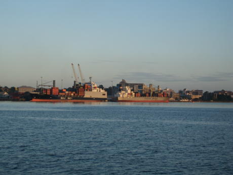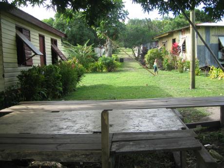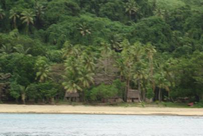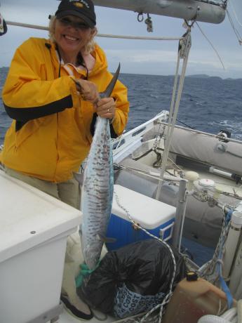 We finally made the west coast after days of beating; this is Denham Island in the sunset. Here a fat tourist walks past the communal shower in the village of Nabukelevuira. Here's a busy street scene in the village. The bures (houses) are simple but clean. Most people here live by fishing or subsistence agriculture. We naturally departed on a day of rough seas and rain so thick we couldn't more than a mile or so, making the whole sea a gray void. We sailed up the north coast back to Ono; in most cases the visibility was so poor we had trouble making out the reef passes and we were frankly sick of bad weather. But after a rough night at Naiqara Bay we had a great sail back to Suva, making the 47nm passage in 6 hours, which is fast for a sailboat. We not only had a fast passage but we caught some fish! Here the proud admiral stands with her prize dogtooth tuna, so called because it has really nasty teeth. We also had 2 mahi-mahi on the lines at one time but they conspired to foul the trolling lines and got away as we tried to sort them out. So much for fickle weather in the southern parts of the islands - now we go to find better winds and water in what we call Fiji Northeast.