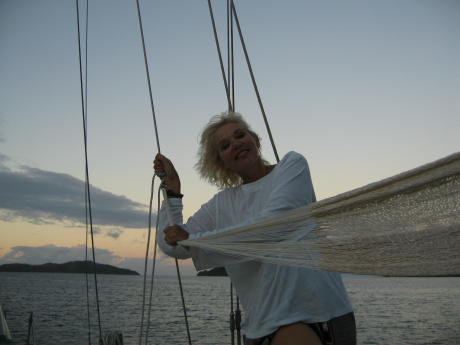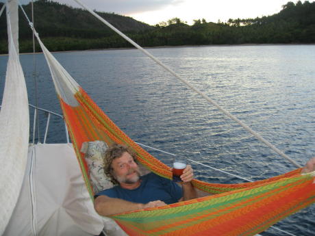 Ah, the myth of cruising. Here's a rare moment of decadence on the foredeck, savoring a brewski at sunset. The unfortunate reality in this case is we'd spent almost 2 weeks dodging nasty winds and seas before having a day nice enough to put out hammocks. But, you have to take your leisure when you can get it.