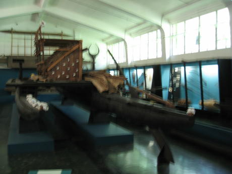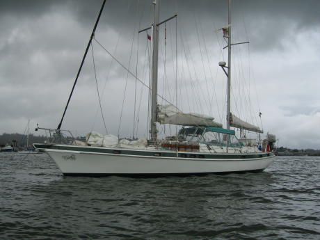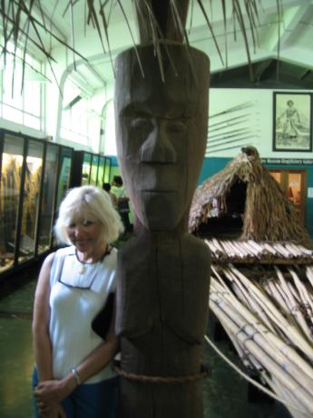 This is King's Wharf, Suva Harbour. Here's the old tub just after arrival. It's about noon but you wouldn't know it, owing to the almost perpetual overcast one finds at the E end of Viti Levu, the largest of Fiji's 300 islands. Most of the cruising guides we have were written 15 years ago. We had read that we should expect a boarding by quarantine officials and would have to tie up to the wharf seen above, but the reality was that the Captain had to walk into town (no money for a cab) and proceed to Customs at King's Wharf, where they were very nice and really didn't seem to care much about how many cases of beer we had or about our fresh meat, etc. One thing that hadn't changed since the guides were published is that there's tons of forms to fill out; once again, you could declare a bazooka and they wouldn't care, but you did have to fill in the blanks anyway. This is Suva Prison, conveniently located across from the Royal Suva Yacht Club; note the frescoes. It was built in 1913 and is probably not as festive inside as out. We spent a week in Suva, half the time looking for a special tool to remove the fuel injectors from the generator. After finally finding one, we discovered it was just a dirty air cleaner, i.e. we didn't need the tool at all. Such are the adventures while cruising. Someone once defined sailing as "fixing things in exotic places"; this is only half true. The other half is looking for parts & tools in exotic places. The picture above shows that we can still be tourists. This is a blurry photo of one of the last Fijian sailing canoes, or druas, built in about 1910. The sails are woven from palm leaves. The white things are cowry shells, which were deemed to have spiritual powers. Here the admiral stands next to a house post, with a canoe in the background. If the post was used in an important building, a human sacrifice was buried beneath as spiritual protection. Fijians were enthusiastic cannibals, one chief having racked up 872 victims in his career. You can buy the special forks they used for dining on "long pig", but we found such souvenirs rather tacky. After a week we finally left Suva. We felt like there was more stuff we needed to get, but places like Suva can hold onto boats like a magnet, i.e. you can buy most anything and leaving a land of plenty can be difficult. The photo above is of the island of Beqa, about 25nm SW. It is surrounded by a lovely lagoon and we hoped to finally get some sunshine and nice diving. We ended up anchoring in the bay you can see to the left, i.e. the saddle which is really an old volcanic crater. This is Malumu Bay and not described very well in any of our guides. It proved to be a great place to obtain shelter from the winds and seas. This is a view of Viti Levu from the mouth of Malumu Bay; note the glassy water. The main downside to this quiet environment is the water is murky and the shore is lined with mangroves. An additional problem is that Fijians are very territorial and you don't go ashore without getting permission from the local chief. This requires a ceremony called "sevusevu" which involves an offering of the semi-narcotic plant known widely as kava. The challenge in this case was trying to determine which village owned the land and water you see above. We decided to just stay on the boat. After a day at Malumu we decided to sail for a small island to the west named Yanuca. There we hoped to find some great diving. The diving there may be great but the weather sucked big-time. We anchored in a coraline area with poor holding and had to listen anxiously all night while the anchor pretended to drag us toward the fringing reef a few hundred yards behind us. We could barely see the bottom because it was totally overcast. After rolling and grinding all night we opted to return to the cozy confines of Beqa's Malumu Bay. Our decision was also influenced by the fact that the pious Fijians don't approve of recreation on Sunday. Anyway, the photo above purports to show a quaint Fijian village. We didn't visit it but suspected the village was really a prop for a resort located slightly to the right, sort of a "Six Flags Over Fiji". We had resolved to maintain this website on a timely basis once we had something created. This has been facilitated by the fact that we have been stuck on the boat for almost a week now, imprisoned by lousy weather. As an expat in Tonga pointed out, the great secret to the South Pacific is the frequent crappy weather. The great deserts of Australia spawn a succession of high, lows and fronts that sweep eastward and often increase as they do so. Oddly enough, the highs are often worse than the lows, because they reinforce the prevailing SE trade winds, making a pleasant 15kts more like 30, which means rough seas and poor visibility. The fronts add their own contribution in the form of unsettled skies and squalls. However, after 5 days of gusty gloom we plan to sally forth in the morning, to we hope a more pleasant stay near the island of Kandavu. We departed for the islands north of Kadavu in the Great Astrolabe Reef. We figured this would be an awesome place to dive. It probably is whenever the weather permits, which was not while we were there. We made our first sevusevu at the island of Davuni. The natives were very friendly. We were forced to leave by a sudden onset of strong west winds, which made for a sleepless night as we had no protection in that direction save the modest west side of the reef. We found a much better anchorage on the island of Ono called Naqara Bay (you could win big in scrabble if you could use Fijian words). Our sevusevu at the village was very nice. We were invited to a dinner and kava-fest. Their singing was most enchanting. We wanted to show pictures but naturally the camera battery died.
