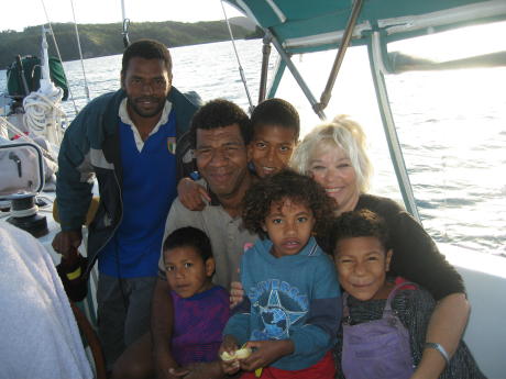 Here's a moment of tranquility at Galoa Harbour. Some locals wanted to show their kids a "yacht" so they piled on and we played host for a bit. These kids are great, some of the best-behaved in the world; the dads are properly proud.