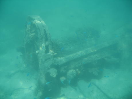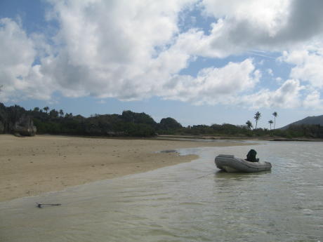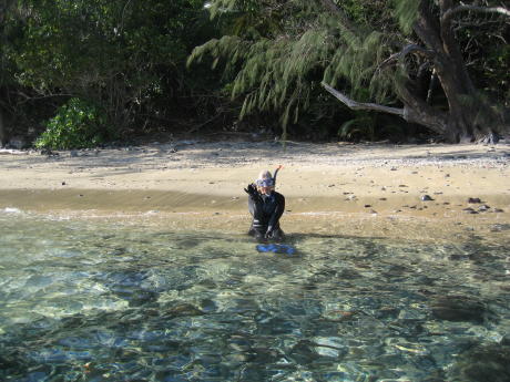 The neat thing about this deserted stretch of paradise is that it has lots of nautilus shells, one of nature's true works of art. Speaking of natural wonders, here we see a strange amphibious creature crawling onto the beach; note the gin-clear water.