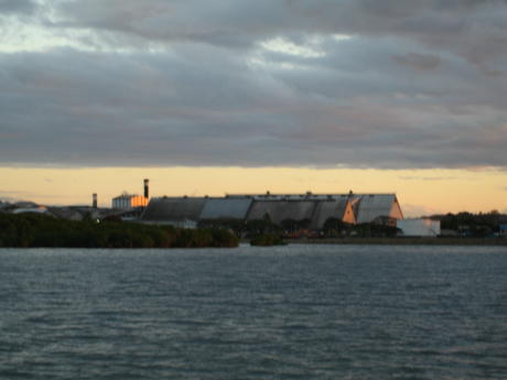 This is the huge Fiji sugar refinery in Lautoka, as seen from the harbor anchorage. This shot is unusual in that it's not belching huge quantities of smoke. It covered the boat with soot, just a day after we washed it so well. We had to go to Lautoka for the simple reason that Fiji Customs insisted. They never would have known if we were there or not, but asked us 10 times anyway.