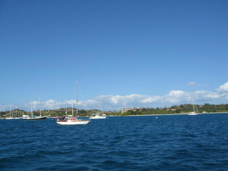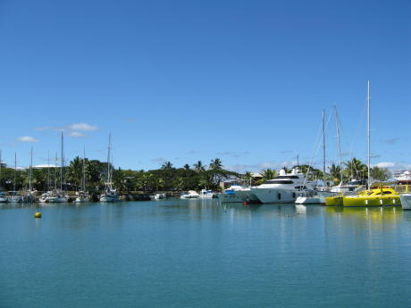 This is Vuda Point Marina. It looks nice, but the admiral nicknamed it "Voodoo Point" or "Doodoo Point" - you get the picture. A former waste treatment pond, it still handles human waste, owing to all the potties on boats and the very narrow inlet one must traverse to get here. Capt Hub was supposed to do some diving on a leaky seacock but declined the honor of a cesspool gig. It's located near numerous picturesque tank farms and propane storage facilities. There's a resort next door with a nice view but a muddy, mangrove-infested beach. We had to stay here 2 weeks while trying to get the diesel generator fixed. We hated every moment there but needed AC power for our fridge. We didn't know it, but the routine upon arrival is to tie up to the yellow mooring buoy seen on the left and await assistance tying to the circular rim of the concrete (former waste) pond. We tried to call them on the radio for instructions, but they had the volume turned down so as not to disturb themselves. After trying for 30 minutes we called them on our Iridium satphone and were put on permanent hold. We decided the staff was on drugs and had been fired from their jobs at the DMV office for poor customer service. Nuff said.