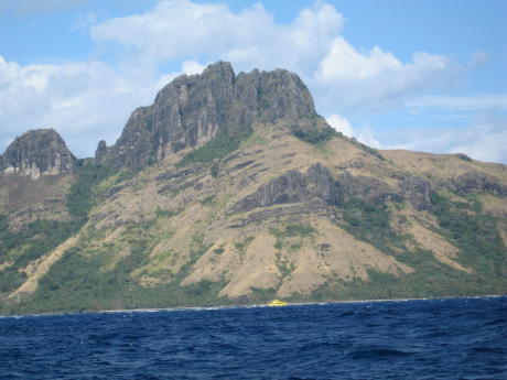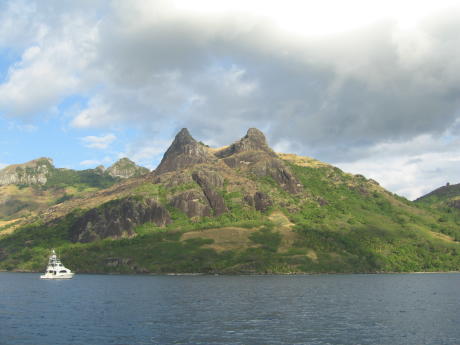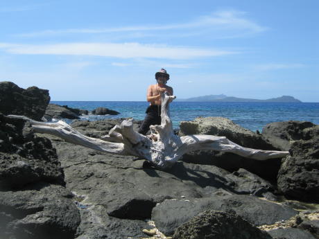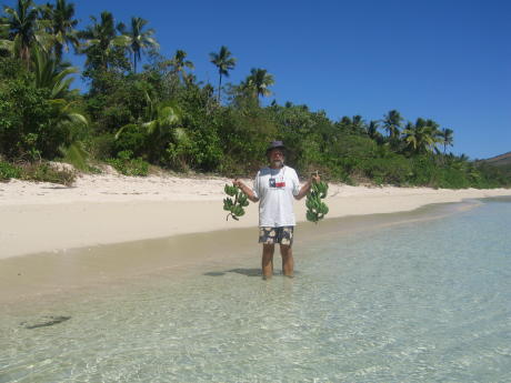 John and I found unusual beauty on this arid isle. The waning sunlight unkindly clouded these crystalline waters. Another isolated uninhabited and 'all to ourselves' unspoiled beach. While visiting Sawa we were treated once more to a couple of days of Fijian gales. We had become rather tired of high winds and rough nights, so we left for the island of Naviti and what we hoped was rest. We found it at Somosomo Bay. Here we are just off the village of Somosomo, at least the Naviti version. The bay is a little rolly but well-protected and safe. We made our sevusevu in the village, which is unusual in that the chief is a woman. We were invited to visit the school; as we can see, kids always want to be in pictures. We were also invited to a lovo dinner. A lovo is an oven in the ground. Basically, you build a fire on some rocks and when the rocks are very hot, you place the food items, wrapped in banana leaves, on them and bury the whole thing. After a few hours you dig up the delicious results, which we see being uncovered above. One interesting spot on Naviti is the remains of a WWII fighter plane sunk in a lagoon. It turned out to be a P-39, which is easy to recognize because the engine was mounted behind the pilot. This is a murky shot of the pilot's seat rest and a V-12 just aft. A 72-year old we met there said he saw the crash in 1943 after the pilot tried a stunt and couldn't quite pull it off. He was rescued and no doubt scolded for losing government property. Here are the grandkids of our witness. They were some of the nicest kids we've ever met. They are holding up green coconuts they chopped open for our refreshment prior to hiking back to the other side of the island. Some weirdo showed up in the background just as the picture was being taken. Here's our fashion-plate modeling banana stalks. Note the perfect beach. One of the kids in the picture above said some "rich American" guy named Bill Gates had bought up all the beach-front property on the island. He landed in a helicopter at the village of Somosomo with three sacks of Fiji cash and handed it out as a goodwill gesture. At least we got to enjoy the beaches before they begin to require an elaborate licensing scheme and/or frequent reboots of the reef. Our next island down the string called the Yasawa Group was the high island of Waya. Here we see the west coast. For scale, please note the yellow speck on the water near the middle of the shot - it's a small cruise ship. We tried to anchor in the south bay off the village of Yolobi, but it was so rolly we could barely stand on deck. So, we sailed back north to the bay at the N end, which was also rolly but was at least bearable. The scenery was also spectacular. Is this not a fantastic work of Modern Art, Au Naturale. I have seen this very same sculpture in the Metropolitan!!!!!!!!!!!!!!! John and I could not resist capturing such a windswept scene. Sailing south from Waya one leaves the Yasawas for the low-lying Mamanucas. These islands are not as much fun for yachts as they lack good anchorages and are infested with resorts. One delightful exception is to be found at Navadra. It's the island toward the right, the little one at left is called Eori.