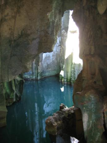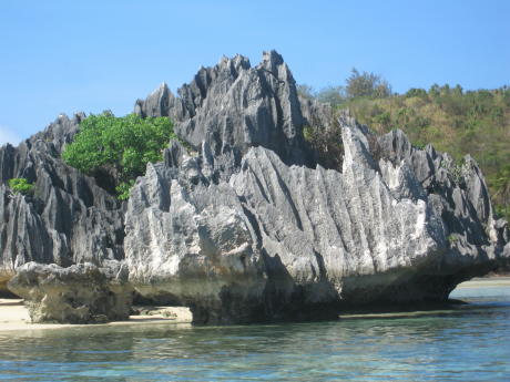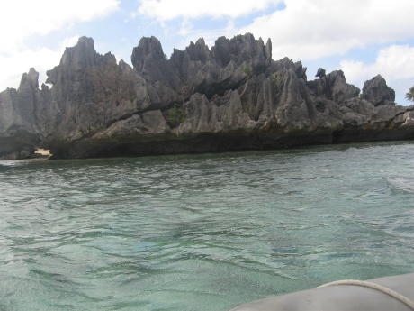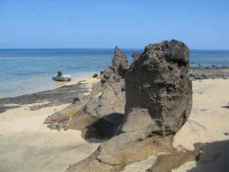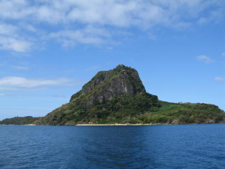 Here's our mermaid with an escargot grande. We left it there. We thought Yadua was a great piece of unspoiled paradise, but we needed to make progress toward our departure point of Lautoka on the NW side of Viti Levu. We were also running low on fresh produce. We therefore left for Yasawa and its neighbor of Sawa-I-Lau. This is Gibraltar-like Sawa-I-Lau. Unlike most Fijian high islands it's made of uplifted coral. Sawa-I-Lau is famous for its caves. This is the main entrance but we were not beguiled by the stagnant pool one must swim through to reach the other cave. We therefore found it rather over-rated. The translucence of the aquamarine and afternoon sunlight high above this coral garden would probably thrill any Monet. Note the beach as it 'glides' into the indigo water. This stark razor sharp volcanic sculpture rests on a bed of soft opalescent sand.