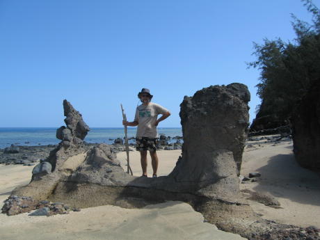 Here our resident fashion-plate Crusoe dude examines wind-sculpted rocks on the beach.
