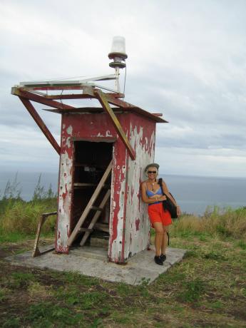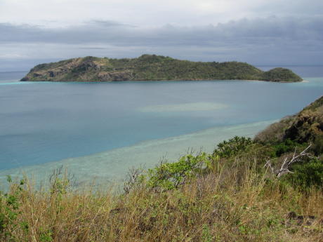 This is Cukuvou Harbor. If you look closely you will see 2 boats in the bay; Amante is the speck on the right. This is Yadua Tabu. The reason it's tabu is because the very rare Crested Iguana lives there. It's so protected that no one can visit without special approval, usually only for scientific study. The fringing reef near the beach in the foreground is visible as light green. Those with a keen weather eye will note a cold front approaching from the south; more on this later. Here the admiral poses next to the light house. It was described as red but she could only see it as white from a distance; now we know why. If you think light houses are still cute barber-pole affairs we hate to disappoint you, but this one is typical. We tried to be good visitors by hiking to the village below to make our sevusevu. We were told it would require 60-90 minutes to reach the village, which is on the other side of the island. It took 3 hours in scorching heat. As we were returning the aforementioned cold front arrived, bringing gale-force gusts and torrential rain. We practically swam back, sliding down muddy mountain trails However, an abundance of fear for the boat and dinghy helped us to return in a little over an hour. After returning the weather got worse and we had one entire day of winds over 34 knots gusting to 42 - in the harbor! It's hard to describe the sheer noise and stress of sustained winds like that, not to mention the abiding fear of being dragged onto the reef downwind. After 2 days of taking a beating the wind abated and we began to scrape off the salt that accumulated from spray and spindrift. Just another peaceful stretch of vacant beachfront. we hiked around this point to find nothing except more wide expanses of perfect powdery fine sand.
