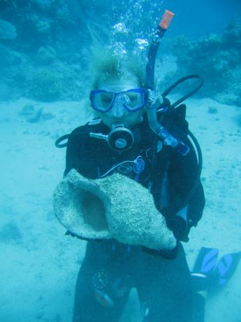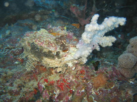 This is a very large scallop-shaped mollusk, maybe a foot wide, which has a white soft coral growing on the front edge of its shell. The effect of the coral was to make our bivalve appear to be wearing a drum-major's hat.