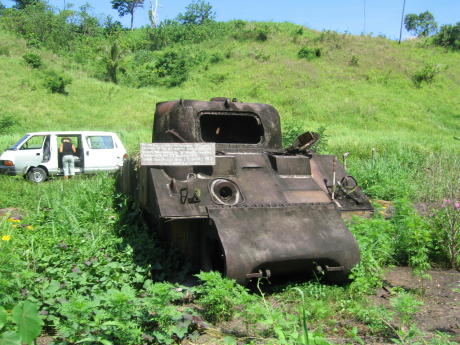This is a sign painted on a rusting Sherman tank in a