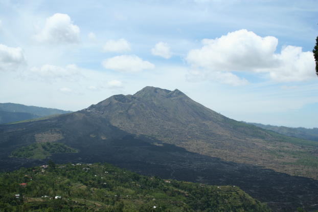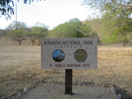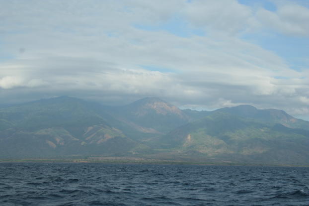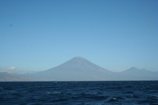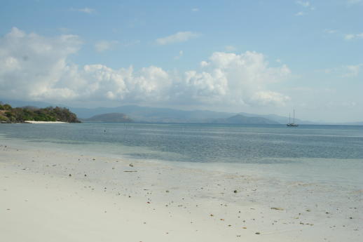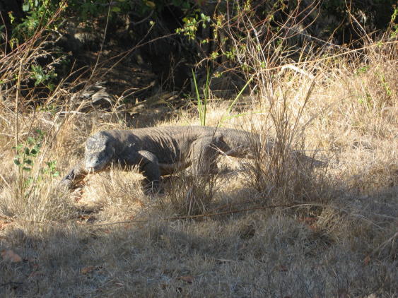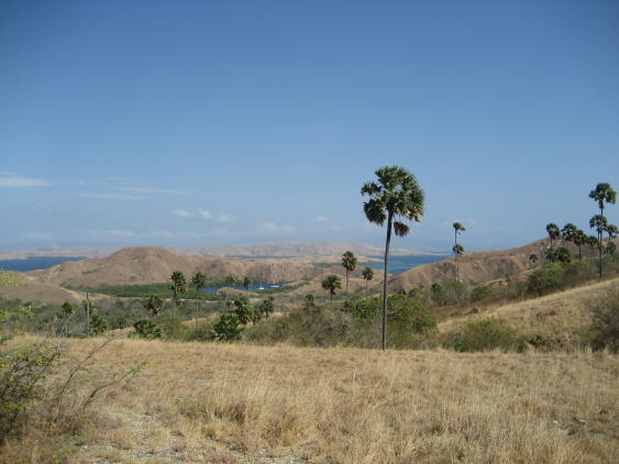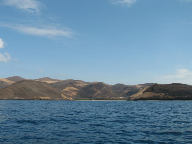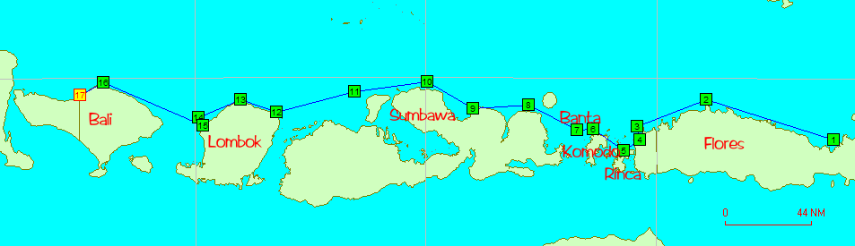 (click on a place to go there) Not all the numbers are stops. Some, e.g. 2,10,13 & 16 are just so we don't have lines going cross-country. This is a shot of idyllic beach on the island of Gili Bodo, home to scads of macaque monkeys. Unfortunately, the island itself is not all that idyllic as it has very little water and can be seen from a distance as a big tan lump of dead grass. This was a harbinger of things to come for quite some time. One of the many surprises in visiting Indonesia is how arid much of it is. We had read of famine on Timor due to drought conditions and now we believe it. We are ready to hit the lush jungles of Bali and Borneo! After visiting the Flores town of Labuan Bajo we naturally had to go off in search of the unique critter that inhabits these parts, the notorious Komodo Dragon. Of course, things being what they are most dragons are not to be seen on Komodo Island itself but rather the neighboring island of Rinca. Here's one in the bush. Note the forked tongue just sticking out. They are actually large lizards, upwards of 10' (3m) long and weighing up to 220 lbs (100kg). They are quite nasty, though, as they can run 10mph (18km/hr) for short bursts and have a poisonous saliva that kills slowly but surely in about a week (they are very patient). The island has deer and buffalo which the dragons ambush in watering holes and other spots. Many hours into dragon spotting , we were longing for a docile deer or two. This gives you an idea just how arid it is here, though this is a lush jungle compared to some of the other islands between Flores and Sumbawa.After two hours of hiking we were broiling by 9 a.m. Far in the distance one can see the anchored yachts. This is what we mean. This is Banta Island, which is a little northwest of Rinca and Komodo. Here even grass doesn't grow and all you see is dark volcanic scree which gets really hot during the day. We walked only a few hundred feet onto the beginning of the slopes where it felt like an inferno. Back we trudged to the "cooler" beach. Our next task was getting past the large island of Sumbawa. We hadn't heard anything especially good about the place so we decided to give it a miss. Here we cruise past the mighty Tambora volcano, scene of the largest eruption in recorded history. It killed 71,000 people in 1815. If you look closely, you will see a cone in the center of a large crater. Tambora was originally 14,000' high but lost the top 4000' in the eruption. The valley seen in front of the cone was caused by a side blast similar to Mt St Helens. It's currently quiet but a similar, but much smaller, volcano named Krakatoa is expected to erupt again soon.