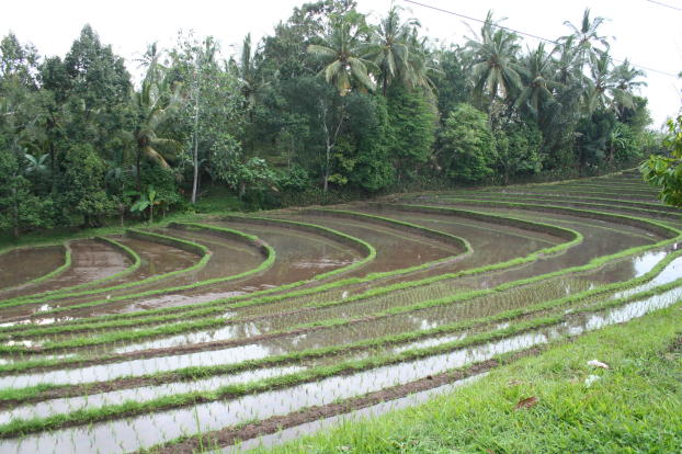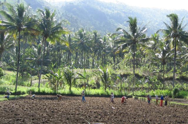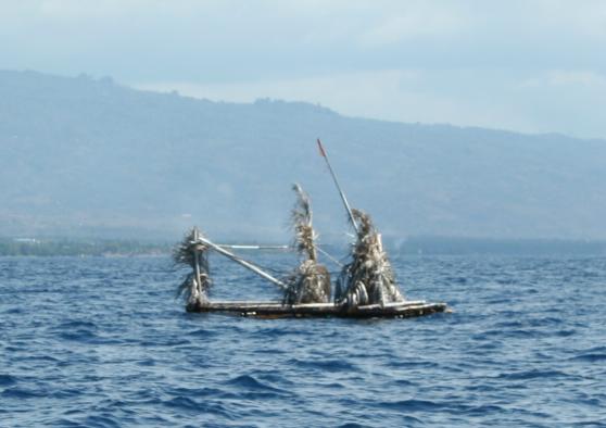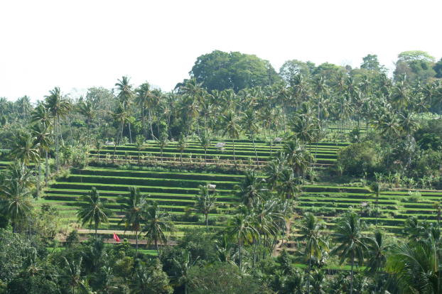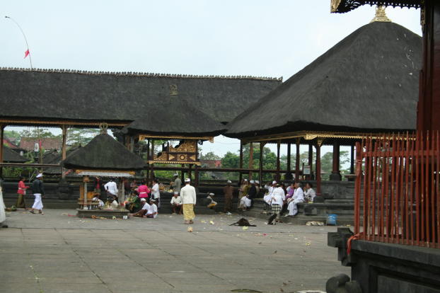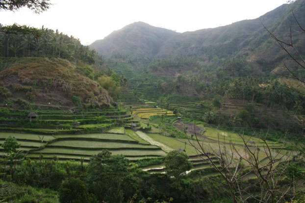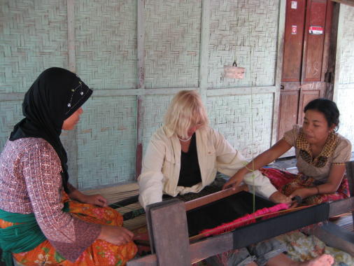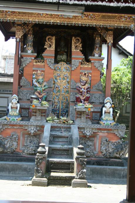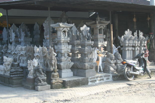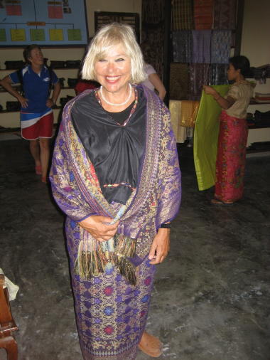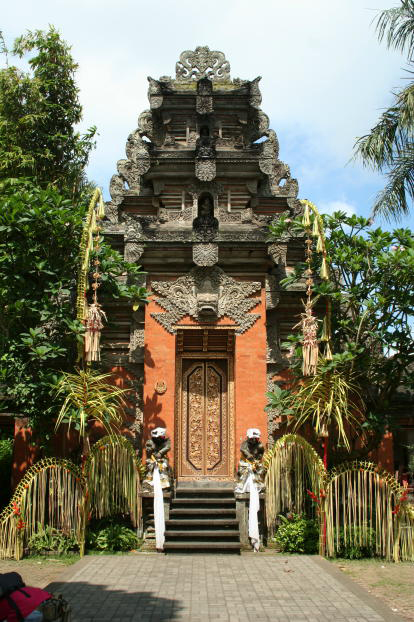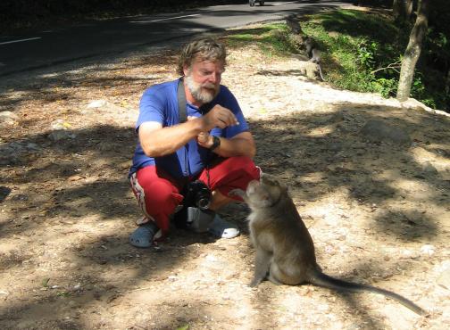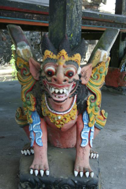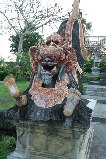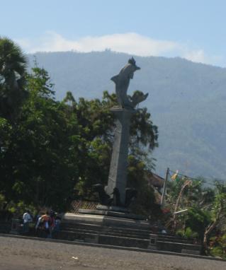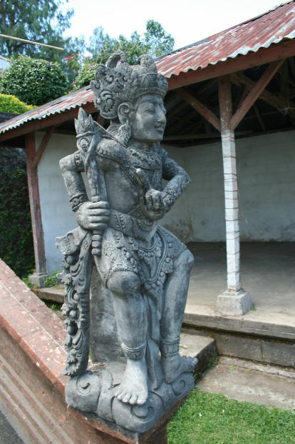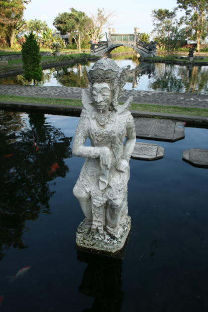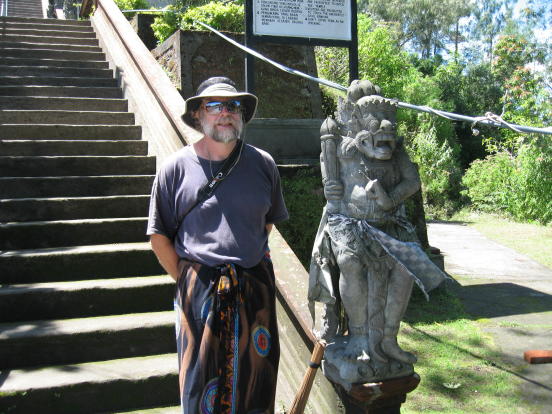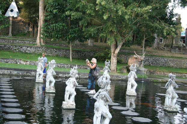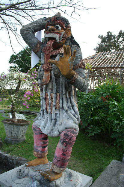 A meeting of the minds. Here Capt Hub holds out a peanut to a macaque. They hang out on the roadside in Lombok and wait for touristas to come by and feed them. Actually, these beggars are not as cheeky as their cousins on neighboring Bali. They don't attempt to steal your sunny's (sunglasses) or camera. Farmers working a rice field on Lombok. This is back-breaking work. They work from sunup to sundown. Sounds like Nursing! Here the admiral receives training in the exciting field of ikat weaving. The women of the village spend most of their time making original fabrics. Better keep your day job, honey. These girls start as young as 14. you need to be able to learn to weave prior to being married. Here our lovely model shows off her (hopefully) hand-woven sarong, all Rp 600,000 worth. Needle$$ to $ay, we forgot to bargain and a$k one third of the initial pri$e. We were $low learner$! The Aussie yachtie in the background looks like she is having none of this! This was our first distant view of Bali, the huge, and sacred, Agung volcano, flanked by the smaller, and more active, Batur. Yachties are often warned not to sail in Indonesian waters at night. This is a main reason why. These unlit platforms are especially common along the coast of Bali. They can be found in water up to 1000' deep. Lovina Beach, North Bali. This rather weird monument to dolphins is perhaps mostly owning to their power as a tourist draw for this side of the island. Lovina is quite a charming stop despite the beachside vendors and fake Rolex hawkers. It's all part of the Bali experience! Terraced rice paddies, a very common sight on Bali. They also grow lots of cloves here. Unlike Lombok, Bali is well-irrigated and here they practice wet-field rice farming. The most stunning feature of Bali is its temples. The objects stacked up in front of the ornately-carved door are offerings of rice and flowers. Unique in Indonesia, Bali is 95% Hindu. Idols are big business here in Ubud, where Buddhas and Ganeshas abound, most cast from concrete. This is a common temple figure, guarding the entrance. This one looks like somebody's bad dream. Capt Hub is the fat one on the left. Note the sarong. This is a racket at these temples. You're required to wear it and they want you to rent it from them for what you'd buy it for at numerous shops. So, we bought them and created outrage as we sauntered past the Balinese Temple "money-changers". Gunung Batur is one of Bali's newest volcanoes, beginning in 1917. Note the large black lava flows in the foreground. Perched on the side of the huge volcano Agung, Besakih is Bali's most important temple. If you look closely, there are stray dogs everywhere. They are not molested, but neither are they fed, causing them to be heart-breakingly pathetic. One of the more interesting sights is the so-called "Water Palace" of the former Balinese king. This is a Koi pond with elaborate steps and statuary, not to mention Koi fish. This is not a statue come to life but a pretty tourist walking through the pond. Can't remember the name, but this figure represents evil. This one represents good. What looks like feet are its hands - go figure... More terraced rice fields. What you don't see in these Indonesia pages are how many pictures we left out - hundreds. However, we must leave Bali and don't have time to add them all, much less any pithy commentary. We shall return, at least in cyberspace. Now join us as we trek through the steaming jungles of Western Indonesia!
