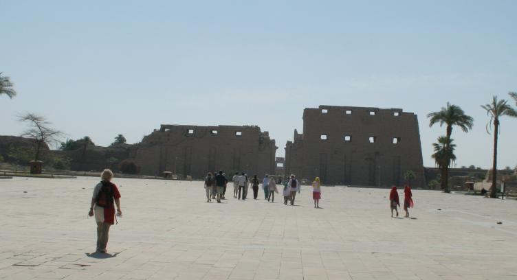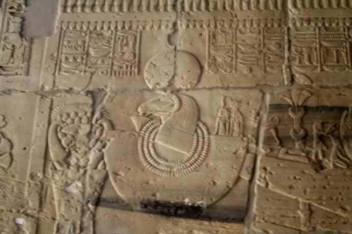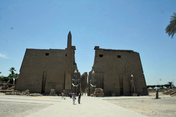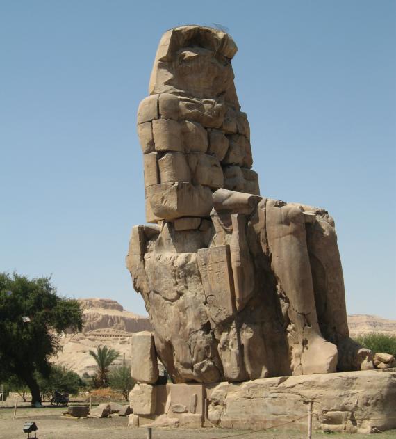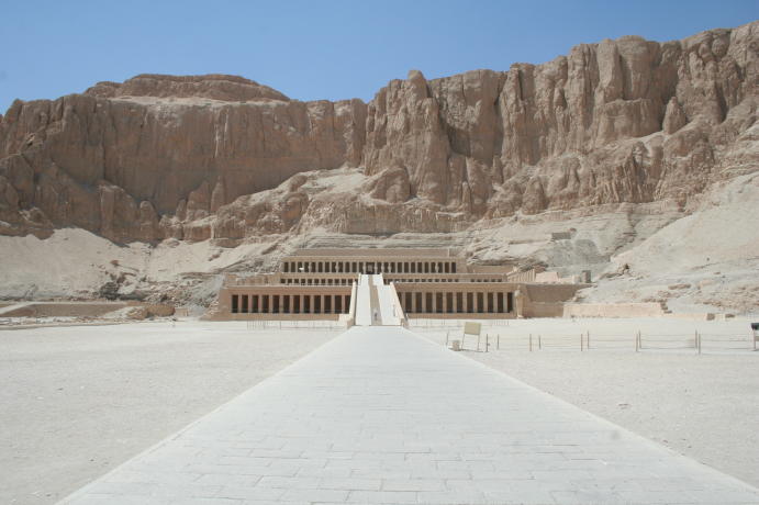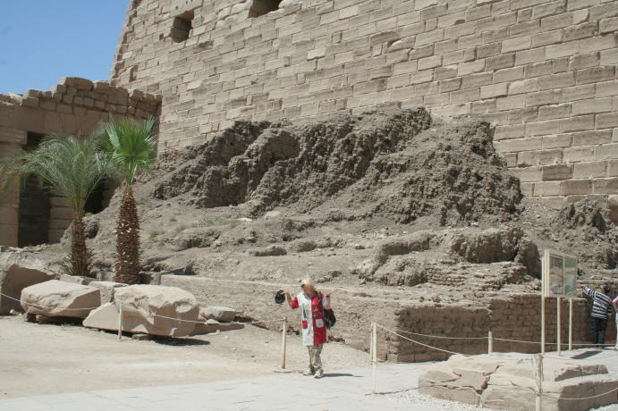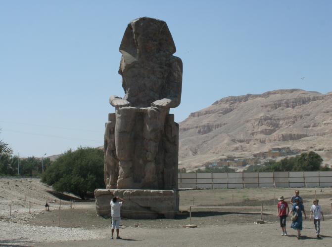 Our visit to Luxor involved a van ride from Hurghada on the Red Sea to Luxor, aka Thebes, on the Nile. This involves crossing the Eastern Desert, which is desolate beyond description. The word "desert" is Egyptian, meaning "red earth". That's all you see. Suddenly, you drop down a hill and the land is transformed, with water in abundance. You are now in the miraculous Nile Valley. Our first glimpse of the Nile. The boats in the foreground are called feluccas and are popular tourist vehicles, only tourism is way down owing to the instability in Egypt. On the opposite side you can see how close the desert encroaches. This may be the longest river in the world, but it's also pretty darn big period. We are crossing the Nile because that's where the tombs are. The West Bank was for Kings, the East Bank for gods. Once a year the priests would haul out the statues of the gods and take them across the river to visit the kings. You came here to see old stuff, so let's get cracking. This is the mortuary temple to remarkable Queen Hatshepsut. The kings weren't buried in these temples, they were just for worship. Note the lack of tourists. Because of the political unrest, tourism is off 85 percent. This is Nekhbet, the goddess of motherhood. Why the ancient Egyptians thought buzzards made good moms is a mystery to us. We were impressed with the lifelike quality of the reliefs, a far cry from the 2-dimensional art often used to depict Egypt. Unfortunately, what we can't show you is the Valley of the Kings, which is just behind the cliffs. Standard Egyptian policy is no photographs, mostly so they can sell books and postcards. All we can say is the tombs in the Valley of the Kings had no ceremonial purpose and were mostly just holes in the ground, usually hidden. The interiors were quite beautiful and if we could have snuck some shots we would have. One of the Colossi of Memnon, actually Amenhotep III. They are bit worse for wear, having been repaired even in Roman times.. Next up were the temples on the East Bank, dedicated to various gods. This one is Karnak, dedicated to the main god Amun Re, who represented the sun and rode across the sky every day in a golden boat.