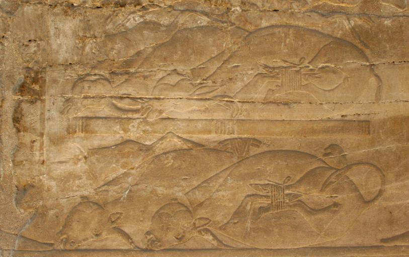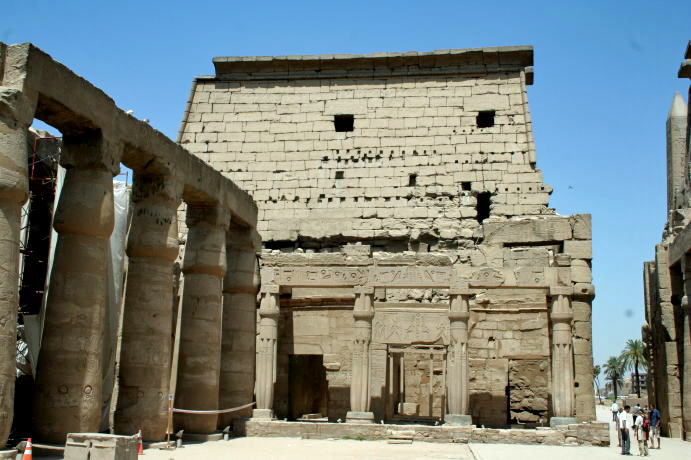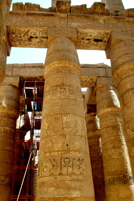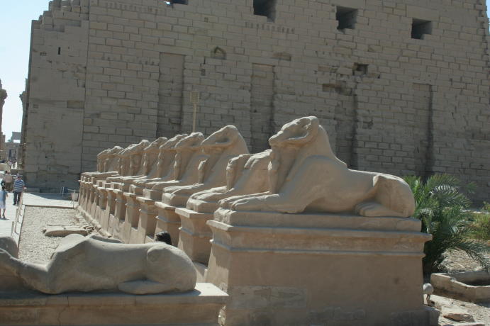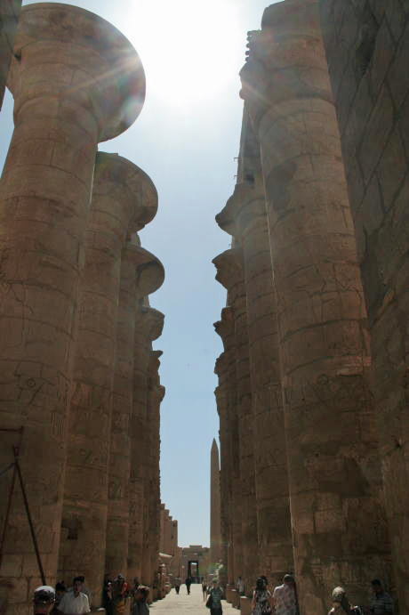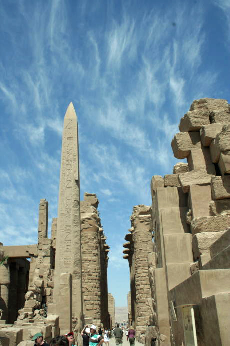 Note that the sphinxes here have ram heads, the totemic sign of Amun Re. Under each chin is a pharoh. Tourist acting silly. This pylon was not finished when Nactanebo I died and they didn't even take down the mud-brick construction ramp. But, that's good as we can see how the pylons were built, even after a couple thousand years. Here is Re crowned with a solar disk on the prow of a boat. Once again, the figures in the relief are quite lifelike. It's not entirely clear, but this depicts Ramses II's victory over the Canaanites. He's holding them by the hair while they put their hands up in surrender. Next up is the massive Hypostyle Hall, a fancy term meaning a hall supported by columns. The capitals (tops) are meant to resemble lotus flowers. The other end of the hall, complete with obelisks. The second obelisk is in Paris.