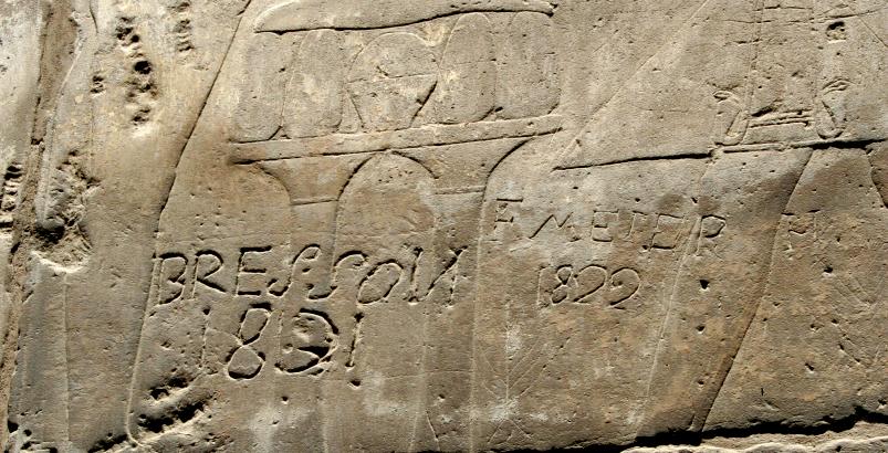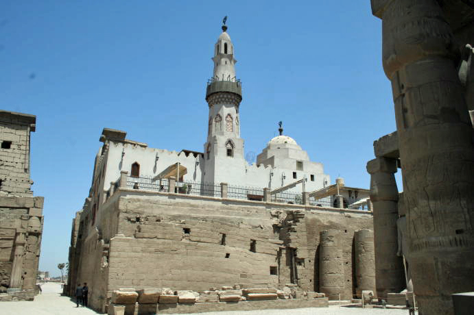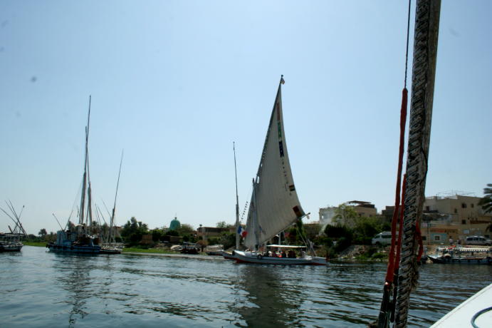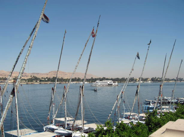 Just some of the graffiti that have been scratched in the ruins over the years. The temple was used in Byzantine times as a government center complete with chapel. They stuccoed the walls and painted frescoes. The pockmarks are attempts by Muslims over the years to removed the images. Nonetheless, you can still see the standing figures. This piece of fresco survived because it's too high to reach with a sword. Never to be outdone, the Muslims built a mosque on the temple ruins to commemorate their conquest of Egypt. Our guide told us the mosque was also built over a church. A phenomenon which is alive and well today. We spent the last afternoon sailing on the Nile in a felucca. This actually was more like rowing on the Nile but that doesn't sound so romantic. Well, that's all for our Luxor trip. We hope you found it interesting. Please make sure you visit Cairo and The Pyramids as well. Thanks!
