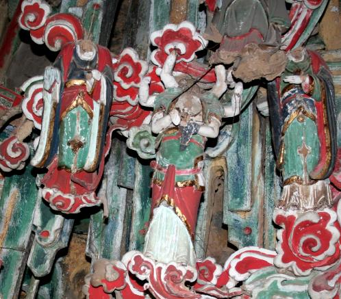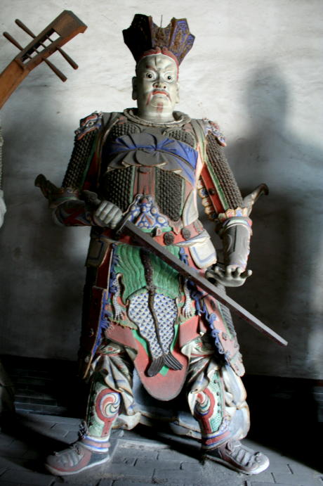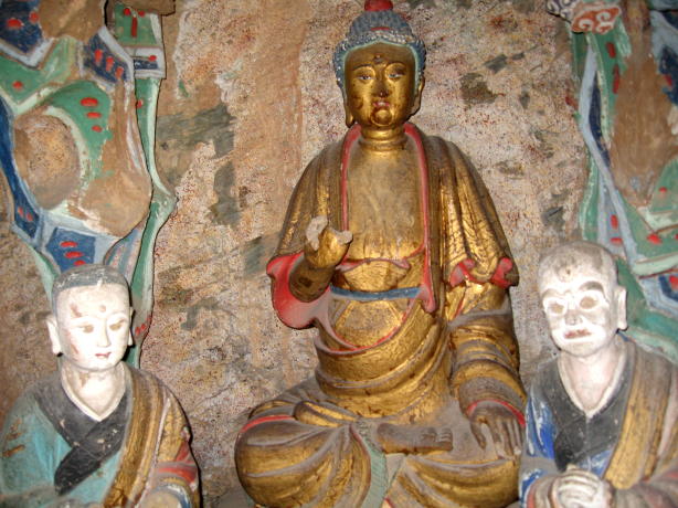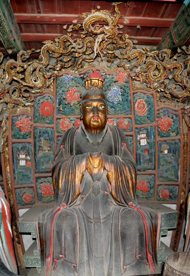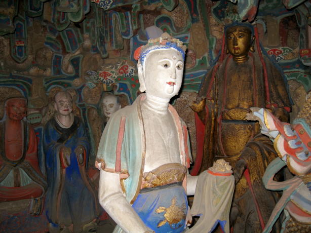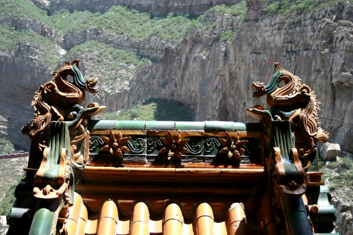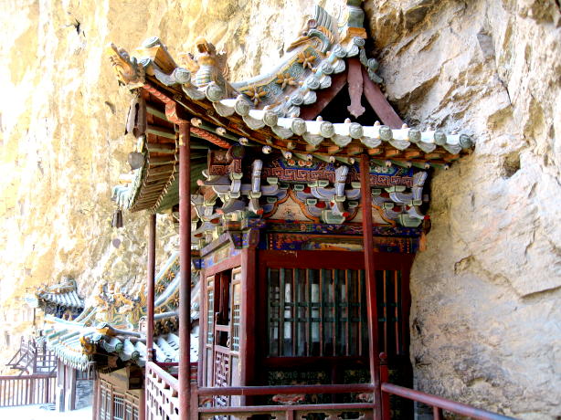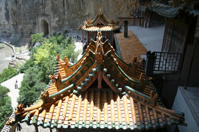 Hundreds of feet off the ground these birds nest size temples house Buddhas in this architectural curiosity. In a sort of ecumenical spirit, here we have one of the Taoist Three Deities, probably Shangqing. The Chinese ruling class was never wholeheartedly Buddhist and still liked the retain the old-time religion, seen here. A view of one of the exquisite tile roofs. Really fine ceramic dragons.