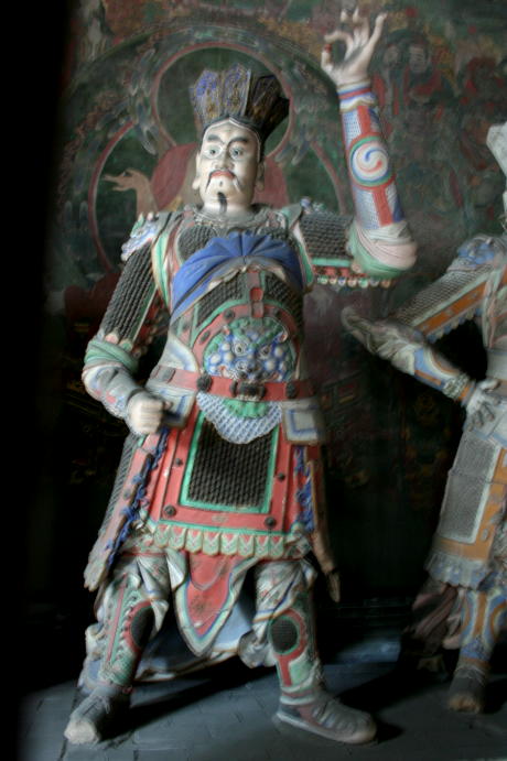 Boy, come to think of it, this might be Virupaksa; we get confused. We can say they are two of the Four Heavenly Kings, the Buddhist gods that guard the four directions. We think he is holding a pearl of wisdom. The wall paintings are incredible but the temple was so dim we couldn't get a good view. The crown is described here.