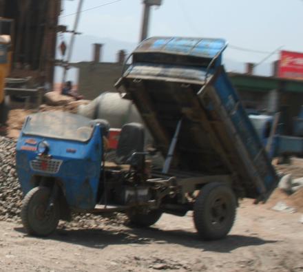 A nice country paifang. The hubster fell in love with another Chinese 3-wheeler, the mini-dump truck. So cool. Gotta get one... A sleepy adobe pueblo in Mexico? Nope, China. See the caves? Until recently, people lived in them. One thing that doesn't look like Mexico is the terraces, even here where not much rain falls. You can see mountains in the smoggy distance. We understand China commissions a new coal-fired power plant every week, mostly out here in the countryside. Cough, cough. We've got one more Shanxi masterpiece to share with you and it doesn't roll on 3 wheels. Join us as we visit the Muta Pagoda!