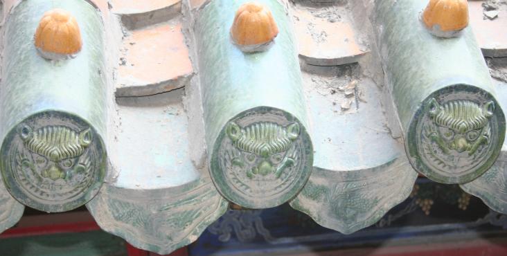 Close-up of the feng shui critters on the eaves. They are interesting because every Chinese tile roof has the same cat-like creature warding off evil spirits.
