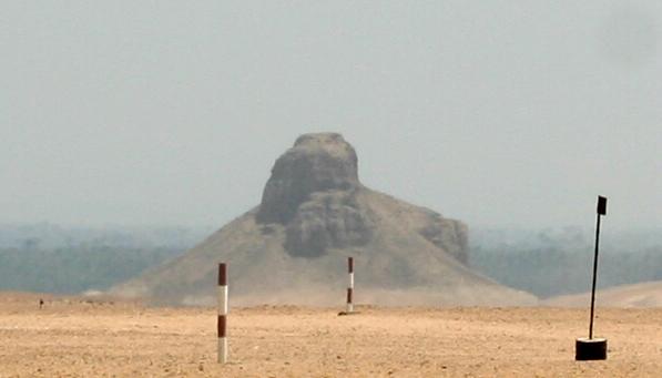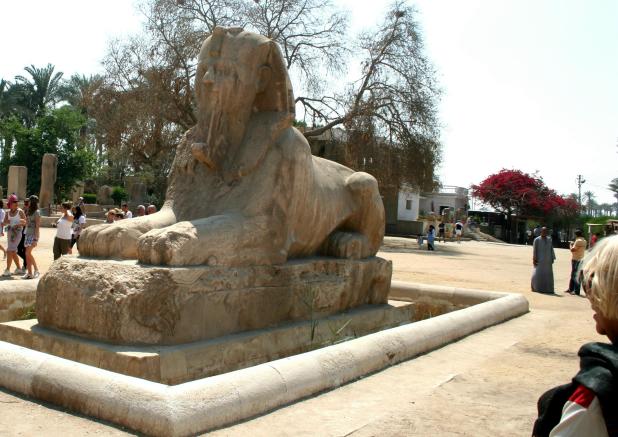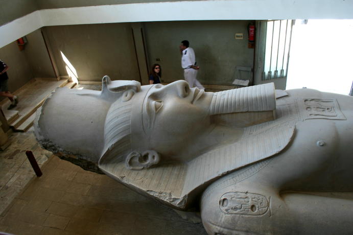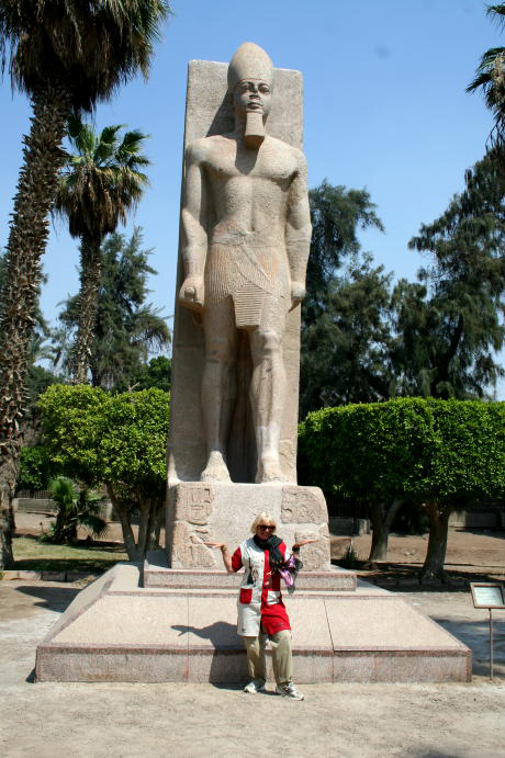 This blackness is the roof inside the Red pyramid. Dark huh? The lack of hieroglyphs and ornamentation is typical. The corbelling of these huge stones is thought to manage the stress of the weight overhead. This chamber is maybe 50' high, 80' long. The Bent pyramid was the first pyramid to be begun as a true pyramid. It owes its name to the change in angle of slope which went from 54 degrees 27' to 43 degrees 22'. If the structure had been finished according to plan, it would have been the greatest. What's left of the Black Pyramid. The admiral cuts it up in Memphis, Egypt that is. There is very little left of the old capital, probably because the materials were carted off to build Fustat, then Cairo. Yet another statue of Ramses II.