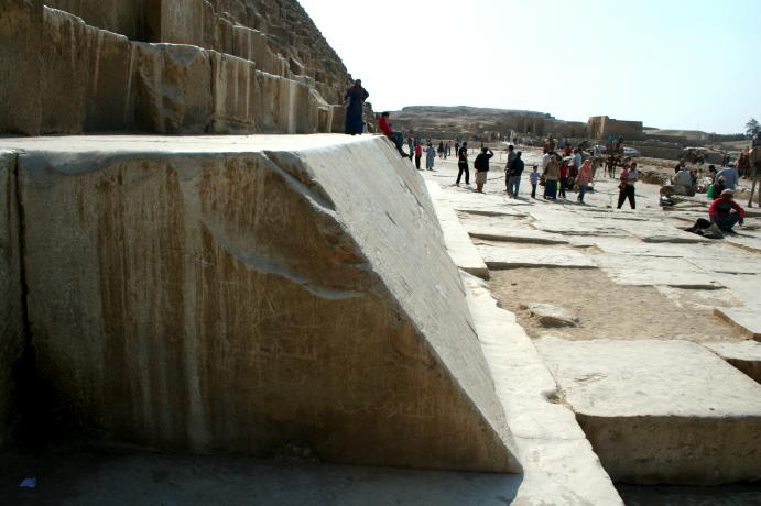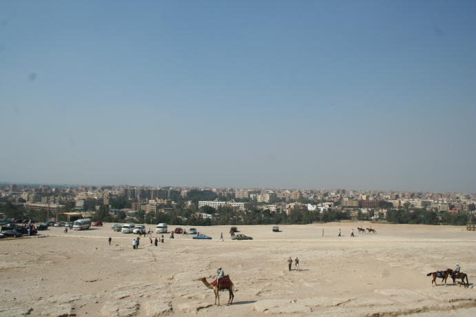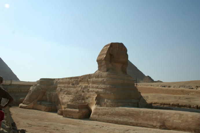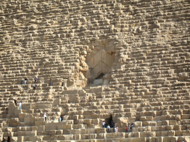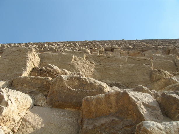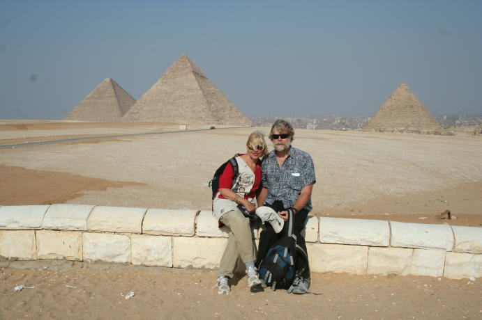 The admirable admiral admires the Alabaster Sphinx. The Colossus of Ramses II. A boy and his......donkey. OK, let's get to the main event, The Great Pyramid of Khufu (Cheops) in Giza. Note the antlike people near the base. The shape is somewhat distorted because this is a composite of 3 pictures. This shows the 2 entrances, the original one near the middle and the one made by fortune hunters below it. This is the view from the Great Pyramid showing how close modern Cairo encroaches on the site. This is why it had to be done as a panorama, i.e. it's hard to get far enough away to shoot in without a wide-angle lens. A close-up of the 2 openings. We didn't go into The Great Pyramid. There isn't anything there other than a shaft and an empty chamber in the center, much like the Red Pyramid shown earlier. It costs extra and you have to line up for a limited chance to go in. You can't do everything... A view of the climb up, which you're not allowed to do anymore. This is a shot of some of the few casing blocks left. Originally the pyramids of Giza all had smooth, white limestone casings, with the blocks so precisely cut that you can't insert a piece of paper between them. Unfortunately, the casing blocks were looted by the Muslims building the Citadel and other buildings of Fustat and Cairo, so this is about all that's left other than the casing at the top of Khafra's pyramid. All part of a hard day being a tourist. The 3 pyramids in the background (l-r) are the Great Pyramid of Khufu, the slightly smaller one of Khafra and the little on of Menkaura. The middle one looks larger because it's closer and higher on the hill. Side bar: After visiting Cairo in the 1980's,a certain party was interesting in sharing the sights and sounds of the pyramids. One must say, that change is not always for the better. Though the sensational structures still were breath taking, the intense battering to buy from the vendors was enough to be glad to say good riddance to Egypt. Though the archeological beauty is second to none, we were joyous to get into the Med! The Great Sphinx ever lasting and ever present. He guards the mortuary temple of Khafra. Resting after a hard day of pan handling. Yes, Egypt does have its street people and its usually the fairer sex. Unfortunately, this has become the standard outfit of the modern Egyptian woman, a far cry from Nasser's day. We took tons more pictures but try to emphasize stuff that's seems more interesting or different than the usual tourist shots. We hope you enjoyed this and will visit Luxor and Cairo before you leave Egypt. Thanks!
