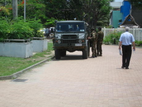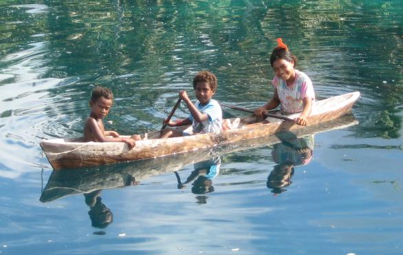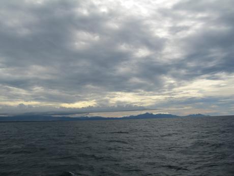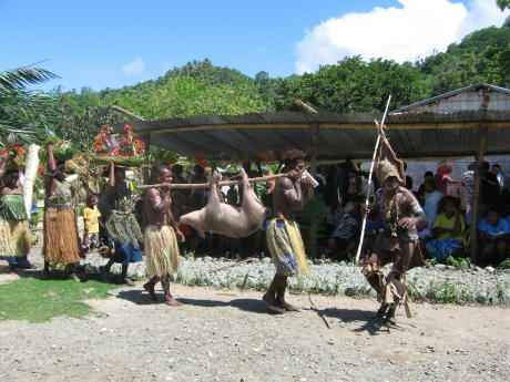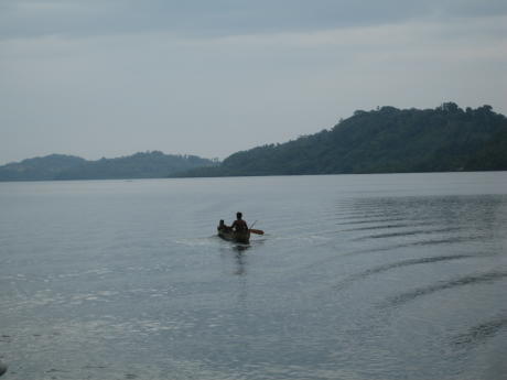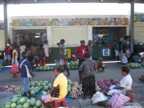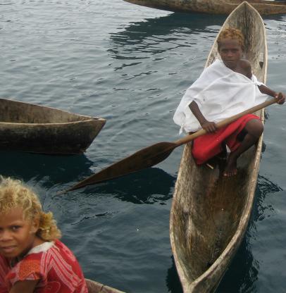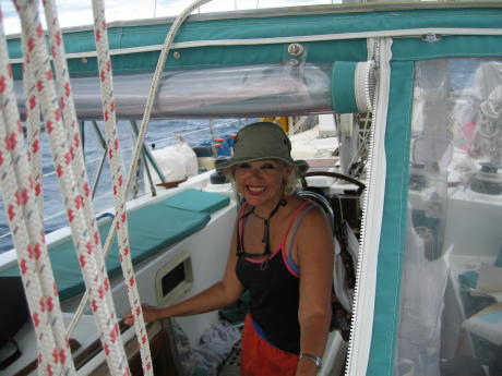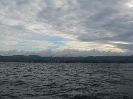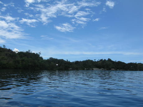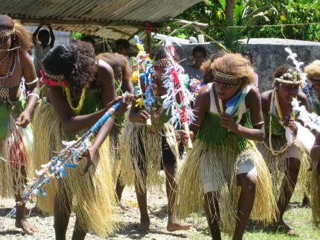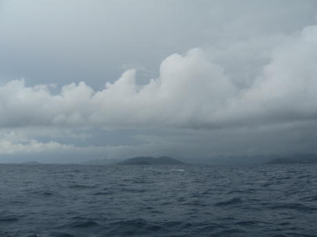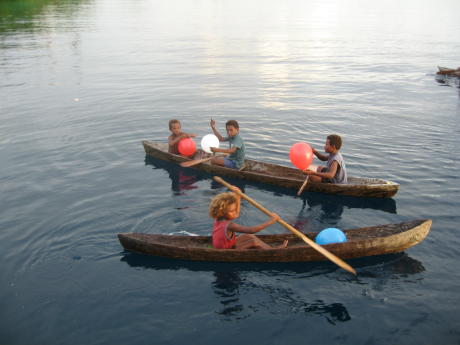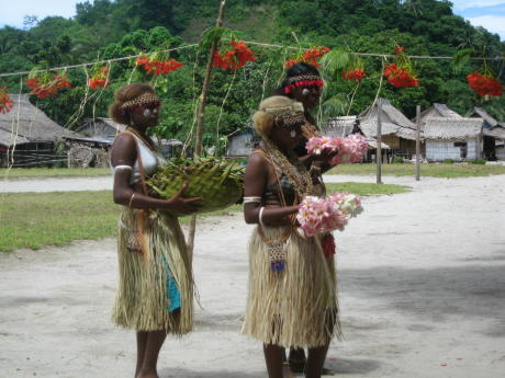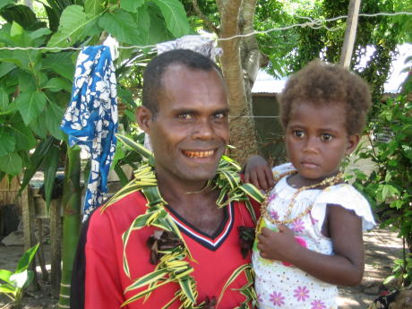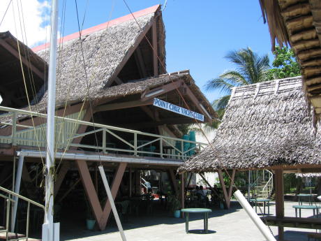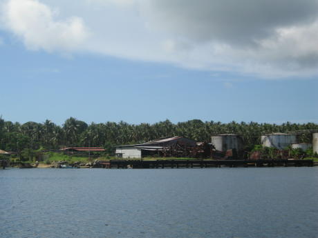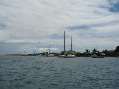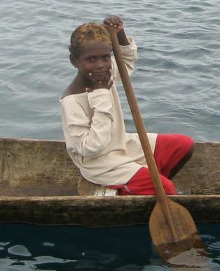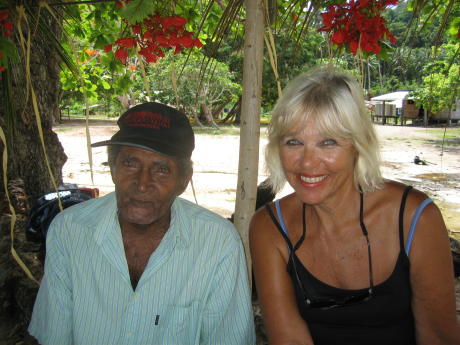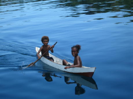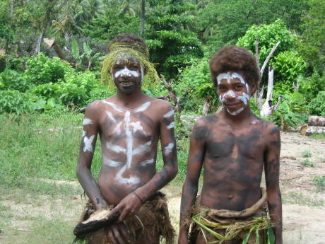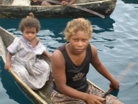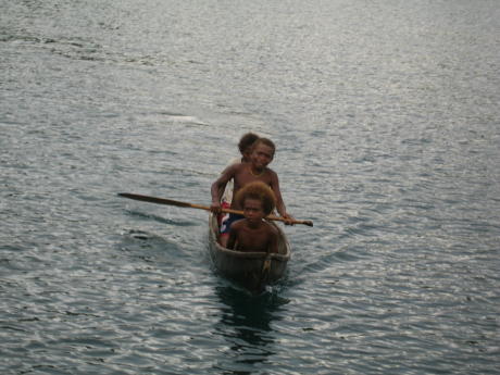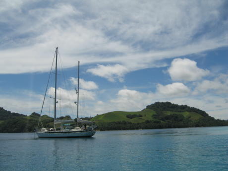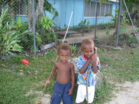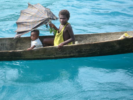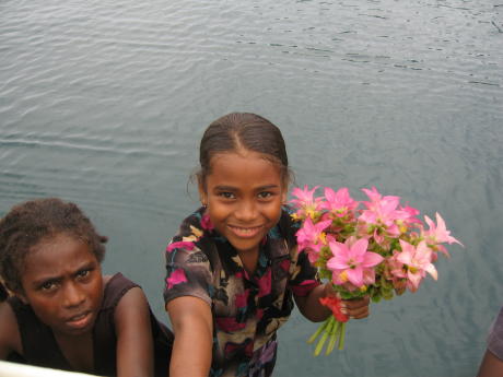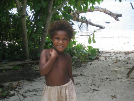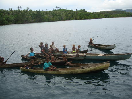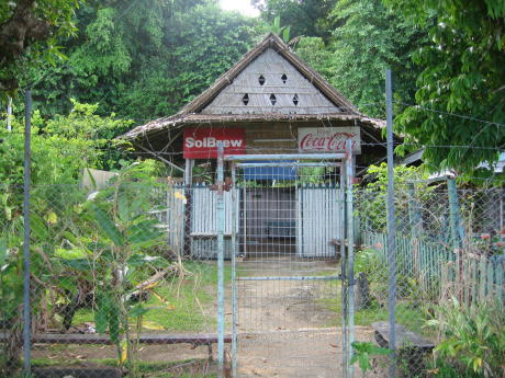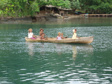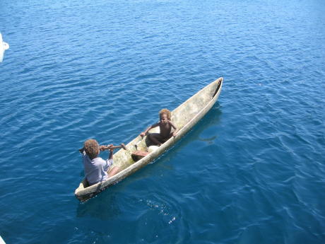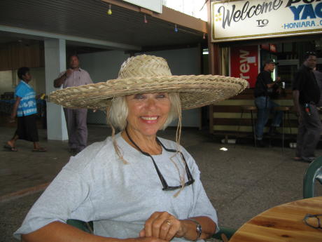 (click on a place to go there) The real adventure starts here... San Cristobal Island is about 80nm long, but all we ever saw is the glimpse noted above. We added the pointer for those who might not see anything here but storm clouds. This is our first glimpse of Guadalcanal, a small group of islands on its SE corner. We wanted to stop and rest but we couldn't raise the sail again if it ever dropped and hadn't checked into the country, so we motorsailed on. After a while the sky began to clear, which was a blessing because our chart information was very sketchy. We started to make out the actual coastline, which was important because there were reefs further off the island. This is a view of the NW coast, about what the Marines would have seen in 1942. Their landing was on the flat coast seen on the left, where the Japanese were building an airfield. Above you can barely make out the capital city of Honiara. It was built on the remains of the US military base after the war. Honiara is actually much smaller than the former base. The vital Henderson Field is just off the left side of the picture on the very flat ground. Here's a ray of sunshine! We arrived just at sunset. We might have been earlier but the capt had to go aloft in a bosun's chair to pull the sail down. When we arrived we had no idea how or where to anchor west of Point Cruz. We looked for a leading light but weren't sure what we saw. As the anchorage is surrounded by a reef this was no small matter. But, we made it! Here's the old tub moored to the seawall, the accepted method in this harbor. Note the small fishing boat off the port side. We discovered that staring is the national pastime of Solomon Islanders. There seemed to be one guy assigned to watch us at all times. We know they're just curious, but it gets rather creepy after awhile. At one time a large, double-decker boat was on our starboard side. Half the crew climbed up to the top deck so they could look down into the cabin. You felt like you were in an ant farm. What is this? These are NZ Army troops, part of a military presence in the Solomons. What you can't see is they carry machine guns, loaded machine guns. Why are they here? Because in April rioters burned down the Chinatown section of Honiara. All is not well here, but there has been no disquietude since we've been here, just lots of staring. This is the main market in Honiara, looking at the watermelon section. This is the Point Cruz Yacht Club. Not too many yachts, but lots of drunk expats. It was handy in many ways. Here's the admiral wearing her new hat. All she needs is a Margarita, but this is the Solomons, not Mexico. We spent the usual time after our arrival checking in and trying to get things fixed. We finally managed to spend a day sightseeing the WWII battlefields, but decided to put that stuff on its own page, named simply Guadalcanal Battlefields. After leaving Honiara we motored to Tulagi, which has a lot of history since it was the colonial capital of the Solomons. This is Tulagi Harbor. We were aware that most of the old capital had been destroyed during the war, but were shocked at what was left, which is essentially nothing. Here are the first real natives coming to greet us. The admiral is a sucker for kids, so she gave them peanut-butter sandwiches. What she did not realize was that the area had, oh, a few hundred more kids, all of whom heard they could get peanut butter sandwiches. As a result, we had a cloud of canoes about us 18 hrs a day. This was our introduction to the real Solomons. This is the bar at the hotel in Tulagi. It's small and very well guarded. Here's some kids on the street; note the blondish hair, which is quite common here. This is the entrance to Mboli Passage. It's a narrow stretch of water between the two main islands in the Floridas. It looks like a river, but it's really just a long, narrow strait. Here's a father-son canoe paddling down the Mboli. Here we're being chased by some kids. These kids are trying to peddle shells as we pass by, but it's hard to stop. These girls have arrived with flowers. They mean business, literally. After leaving the Mboli we sailed to the lovely, uninhabited island of Anuha. Here's El Tubbo in yet another paradise. There we were visited by a family where the baby, dressed in her Sunday best, was being shaded by her older brother using a defunct umbrella. This is typical Solomons. After a couple of days in Anuha, we learned there was yet another cyclone nearby, named Yani. So, we decided to head west, sailing to the island if Vatilau, aka Buena Vista. Here's a greeting party from the village. The naked little girl facing is young, but she can already paddle and bail the dugout. While there we met a really great guy named Clement Kola. He is 76 and a retired chief of the village, just real salt-of-the-earth. He used to operate a tiny eco-resort but raiders from the neighboring island of Malaita came and demanded money. When he couldn't produce any they burned it down. That was in 2003, when troops finally came from outside to quell the anarchy. This is his granddaughter Mary. Like most islanders, she loves to have her picture taken. While we were there we were invited to a feast, which was celebrating the opening of a new primary school. These guys are dressed for the occasion. These girls are greeting the honored guests. For some reason, we became overnight VIPs, probably because we knew Clement. Here's some girls doing "kastom" (traditional) dancing. Here they're bringing in sacrificial pig. However, not to worry, the pig was very much alive and even tried to run away during the ceremony. Here's a proud dad. Note the red teeth from chewing betel nuts. Not only does it hideously stain the teeth making one appear to be a vampire, but it severely rots them as well. After a few days we departed for the Russell Islands, about 45nm west. When we arrived we had the usual greeting. This time we handed out balloons. The funny thing was, 