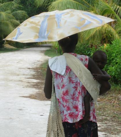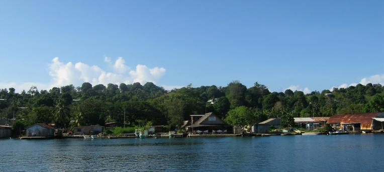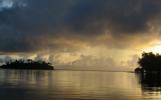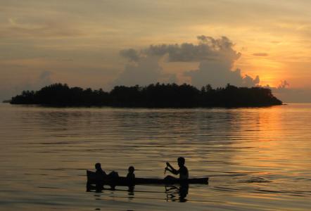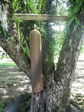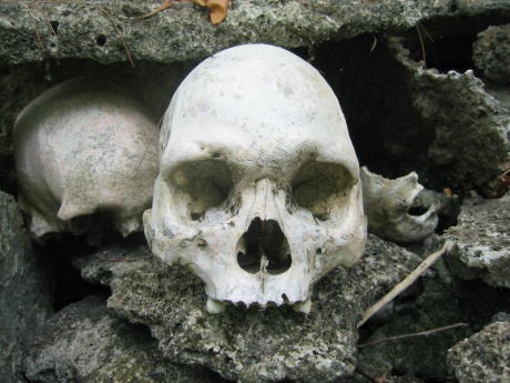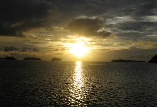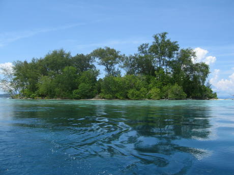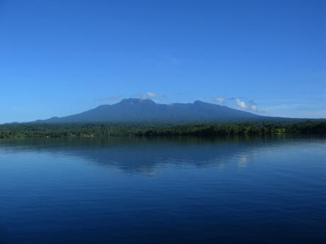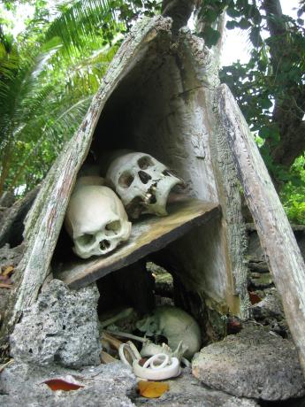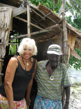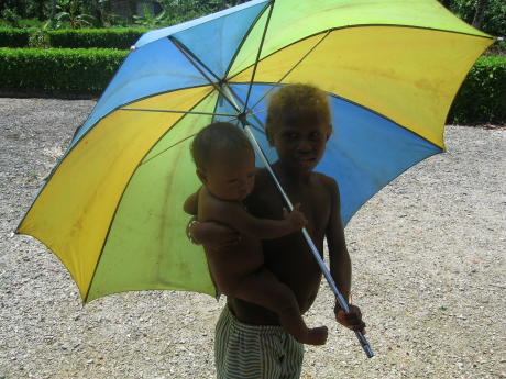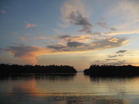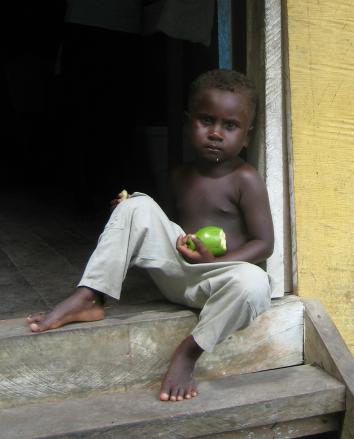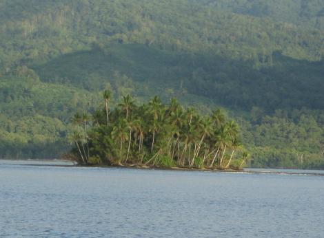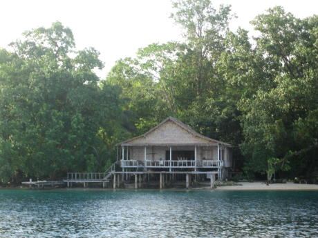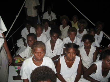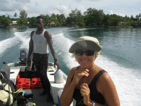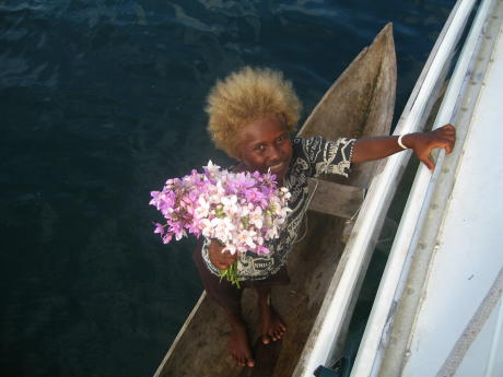 Simply Fabulous This is a small islet at an entrance to world-famous Marovo Lagoon, considered the largest lagoon in the world. The island behind it is Vangunu, which is densely forested but is being rapidly stripped bare of its virgin hardwoods, much of it exotic woods like ebony. We decided that "Marovo" must be a local dialect for "pushy wood carver". The lagoon is a like a vast salty lake, dotted with small islets, each of which seems to contain hundreds of wood carvers just waiting for victims, er, customers. These guys are part pirate, part used-call salesman. We had decided at first not to allow them on the boat, but relented out of courtesy. Bad move. Once aboard they would not leave until they had extracted whatever they could from us. We said we were out of cash so they wanted to trade. This process would take hours as they began asking for just about anything, up to and including the outboard motors. It drives one to suicide. We'd finally give in simply to be rid of them, which was but a temporary respite since 2-3 other boats would be alongside waiting their turn at the looting, er, sales process. We finally decided on a policy of absolutely no boarding, no trading. Otherwise, we would do nothing all day but entertain carvers. (They seem to think this is a perfectly normal thing for us to do and even insisted we allow ever carver aboard to show their wares...) One place to especially avoid is Mbili. This would be a marvelous place with great diving, only it is thoroughly infested with carvers. We'd prefer sandflies, they're cheaper and suck less blood. If one must visit certain places like Mbili, do it on a Saturday, the Seventh-Day Adventist Sabbath. This is the only time one is likely to remain unmolested. Anyway, we'd love to show pictures of Mbili but we refuse to aid them in their quest to snare more yachts. Stay away! OK, after being taken in Mbili we discovered the western side of Marovo is not infested with pirate carvers. This is a shot of Matikuri Lodge, a small eco-resort south of Seghe. The hosts, Benjamin and Jillie, were two of the nicest people we ever met. Their bookings have been devastated by travel warnings that suggest the Solomons are dangerous, which is only true in a few places, most being much safer than Newark or Oakland. We wish we could have stayed longer, but we needed to move west. Our next stop was Viru Harbor, a nice, protected place to spend the night. This is a view looking south to Blanche Channel. What you can't see are the hordes of creepy dudes who came by at all hours. We were glad to be out of there. After Viru we headed for Munda, a famous WWII battleground as the Japanese had built an airstrip there. This is the first place in weeks where we were essentially left alone. The canoe above never came within 50 yards of us. We actually missed our native visits. What is this? It's a pile of junk, mostly landing craft deliberately cut in half and bulldozed into a rusting heap, a gift of the US military in 1945. We wanted a better look, but everybody who lived nearby expected $20 for the privilege. No, thanks. Here's the admiral going diving. The hunky guy behind her was the divemaster, named Sycamore - his mom had a sense of humor and named all the boys after trees and the girls after flowers. Most Islanders have good English names like Nigel and Selwyn, so we found this interesting. He and the other divemaster, Bryan, were great. One thing they have in the Solomons is handsome children. Here's a Mona Lisa of the Islands. One thing they used to have were headhunters. Melanesians believed the head contained a person's mana, or spiritual power. In the Solomons they decided to collect this power by collecting heads. Whole islands were depopulated, the last raid being in 1936. Besides taking heads by force they would collect the heads of their deceased chiefs and warriors and place them in shrines. Here some silent warriors protect the shrine of their chiefs. Here are the chiefs, whose skulls are 3-4 centuries old. Note the shell money in the foreground. The shell rings were used to buy the bride in traditional arranged marriages. The money is still used for that purpose today. Here's the admiral with the island's caretaker, Eddie. His presence is necessary to prevent the locals from carting off the skulls and money and selling it all to tourists. Back to Munda. This solemn child is not sure he wants his photo taken. He is eating what is called a "bush apple." Their serious approach to modeling begins at an early age. You're probably thinking, "Not another sunset!". But, this one has a purpose. This was taken from our next anchorage in Rendova Harbor. The low island on the right is Lumberi, where the PT boat headquarters were located. It's famous because one of the boat assigned here was PT109, whence it left to meet its fate in Blackett Strait. There's a very poor village in Rendova Harbor, populated by Malaitan immigrants. They were brought here to work in a plantation that closed when the British left in 1980. While mired in poverty they are rich in spirit and hospitality. Eye problems are rampant in the Solomons and there are nil ophthalmologists! Note the kids with the severe Strabismus. We visited Rendova in part because they had an Anglican church there. This is the church bell, made from a rusted WWII oxygen cylinder. It sounds surprisingly crisp. Umbrella's are a convenient and practical commodity here in the Tropic's. Nice and utilitarian to shade the infants. Practically everyone owns one. The villagers wanted to visit in order to sing us Christmas carols. They said there would be 16 people; there are nineteen in this picture and about 35 altogether, the most who have been on the boat at one time. You haven't lived until you've heard the harmony of a Melanesian choir. It was terrific having them aboard! We left Rendova with happy hearts but no fuel. We decided to visit the town of Noro to refuel but couldn't, so we went a little furthe