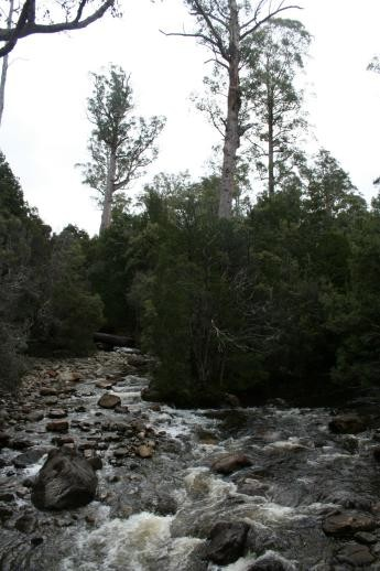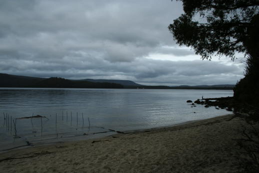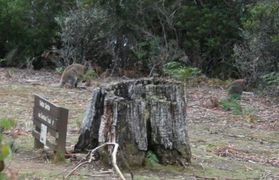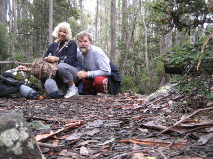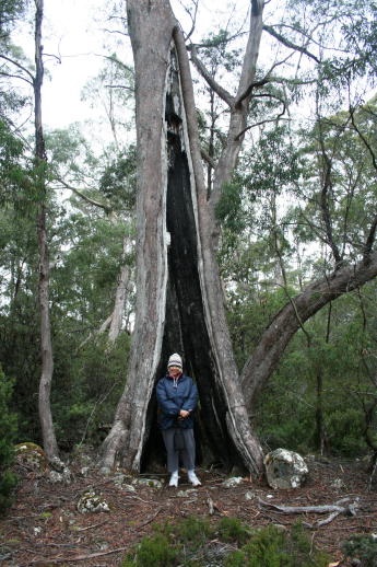 We'd best move on from Port Arthur. However, Tasmania, aka Van Dieman's Land, had many prison complexes. Here we see a stylish inmate showing one of the cells at the Coal Mines prison, a place much worse than Port Arthur. After sleeping over in Lyme Bay, we caravaned to Cradle Mountain National Park Lake St.Clair. It was really cold ,so we pulled out our woolies and got all rugged up to brave the brisk Tassie climate. Here is Platypus Bay - sadly no platypusses. We quietly eased over to the beach at dusk to await some small glimpse of these queer looking creatures. No bueno. The still water stayed motionless to any aquatic evening foraging. We were anxious to go for a solid hike which was advertised as 14 km and named The Loop. Halfway through our forest adventure we plopped down for lunch and a breather.