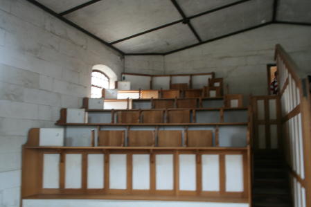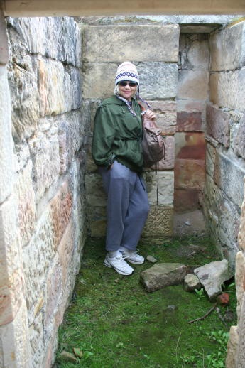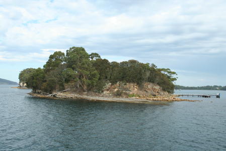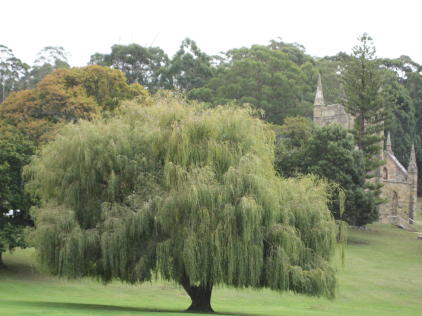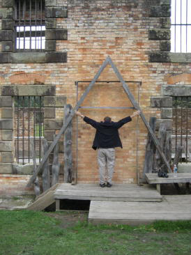 OK, some parts were less enlightened than others. Here our poor Capt Hub demonstrates the use of the infamous "triangle". The admiral was most frustrated that she'd left her cat-o-nine-tails back at the boat - she wanted to lend authenticity to the scene. The Brits who lived here longed for Mother England, so they planted trees like the willow above to create a nice Englishness to the place. The climate is very similar to the sceptred isle. In the background is the ruins of the neat old church, which we believe burned down in the fire of the late 1800s, after the prison had been closed. The modern one in the foreground is called St David's. Speaking of church, this is the chapel in the "Separate Prison", considered the most enlightened part of the complex. In this prison bloc the inmates were not allowed to speak and were kept in solitary confinement. Each cell contained a loom or spinning wheel, i.e. they spent the day working in their cells, where they also slept and ate. The pews above were actually stalls where the inmates were locked and where they stood for the service; a door separates each stall. Each prisoner was fitted with a mask-like hood. These measures were expected to have a calming influence. It's hard to encompass the whole complex in one picture. This is a shot taken from a boat in the harbor showing the old wharf area and main dormitory. It's also hard to imagine all the suffering which occurred in an otherwise stunningly beautiful setting. This is the Isle of the Dead, where both inmates and staff are buried, the former in unmarked graves on the low side, the latter in marked spots on the high.