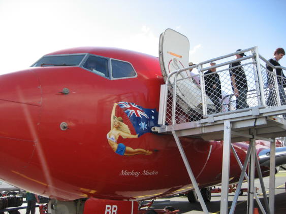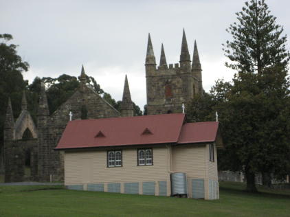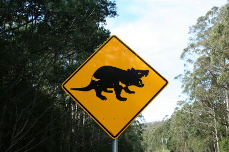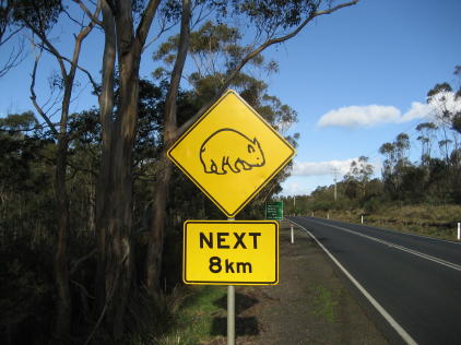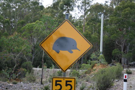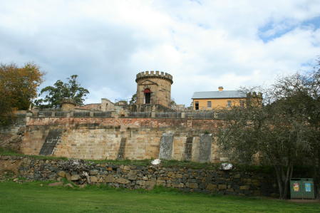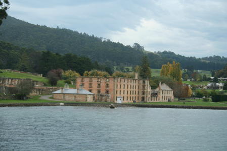 Australia is a big place and we wanted to to see at least some of it. Many yachties buy a car/van and tour the great continent for a year or more. Alas, between refit expenses and soaring fuel prices we just couldn't do that. So, where to go? Most of Oz is arid and desolate. Being from Texas, we had a pretty good idea what that looked like. Since we'd heard that Tasmania ("Tassie" in Aussie slang) was similar to New Zealand and we're big fans of NZ, we decided to visit it as our token Oz trip. We rode the train from Bundaberg to Brisbane, then flew to Hobart to pick up a camper van. Here's a shot of the plane; the admiral is a fan of "nose art". If you look closely, you will see the pilot glaring out of the cockpit. Why? Because they had just advised the passengers not to take pictures when they got off the plane. But for the admiral, art comes first. We were naturally busted by the authorities, who gave us a thorough finger-wagging. Tasmania is filled with wildlife, much of which is plastered all over the roads. The rest is of the metallic variety. Above we see a wombat crossing. This is a Tasmanian Devil crossing. Unfortunately, almost all these creatures have been wiped out by a strange facial cancer that is transmitted by biting. An echidna crossing. We don't think they bite much besides bugs. No, poor Capt Hub was not jailed (goaled?) for his wife's crime of shooting the plane, he's just a tourist at the notorious Port Arthur prison complex. For those curious about the place we suggest reading The Fatal Shore by Robert Hughes. Here's the main guard tower. It looks kinda cool, but Port Arthur was a tough place, designed for convicts that had re-offended after being transported to Australia. On the other hand, it was designed and run using enlightened ideas spawned by the reform movements of early Victorian England.