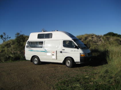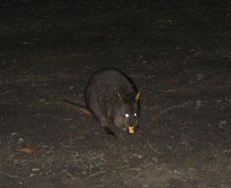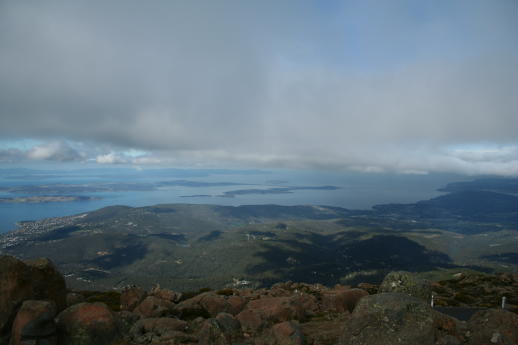 We continued to follow the stream towards our new Mecca. The Campground! Alas, weary and sore we plodded into our quiet unpopulated sanctuary. No other trekkers but there were 'roos! They're cute but not very friendly. Speaking of 'roos, this is a pademelon wallaby, a sort of rat-like version of a kangaroo. Here we see it eating its natural prey, which is an Australian version of a Cheese-It, i.e. they like to infest campgrounds and shake down visitors for a handout. The marsupials of Australia fill niches similar to those found in N America. In this case the US niche would be filled by a squirrel or chipmunk. What was surprising is how much fighting they would do over the crackers, growling and attacking one another. This is not too surprising, since the admiral will growl and attack the Capt whenever they try to share a box of these crackers ( "biscuits" actually, Arnott's Cheddar Shapes), which are quite tasty. After our lovely 2 whole days at Lake St Clair we turned back south. This is a view of the Derwent River estuary from Mt Wellington. The city of Hobart can be seen to the left. For some reason we like to take pictures of our rental vehicles. The basket-like thing below the windshield is designed to deflect small stones. That's our little Tassie trip. It seems most of our views of Oz will be from the water. If you came here from the Australia page, please press here.