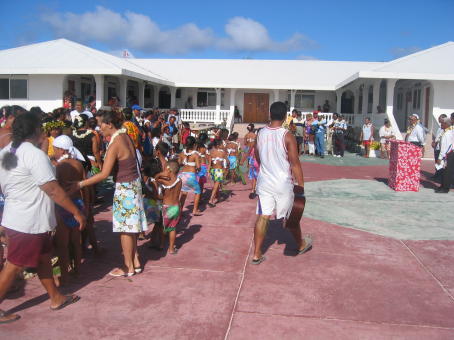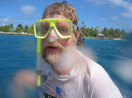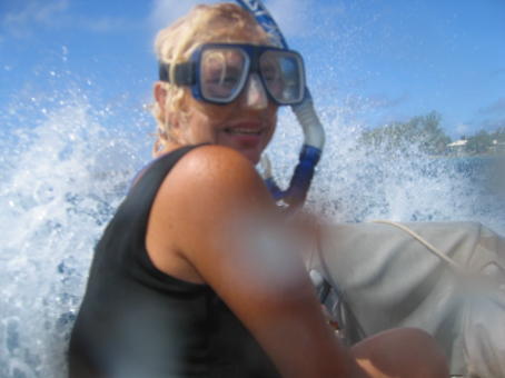 We really didn't give the Tuamotus a fair visit. This was a combination of awful weather (Maramu winds) and a bad choice of an atoll, which was Manihi. If we had to do it over again, we'd probably sail for Fakarava or maybe Rangiroa. Bastille Day in Manihi. The kids are about to hula in ways you can't imagine. Here we appear to be playing around, but we're really trying to get the dinghy across the lagoon in 25kt winds and an awful chop. We had Maramu winds for over a week, which kept us pinned down behind a motu (island) with murky,green, remora-infested water to play in. When we tried to raise the anchor we discovered it was wrapped under a coral head. We had an idea it might be a problem after the admiral dropped her glasses overboard and we were forced to dive amidst schools of remoras. If you haven't been visited by a remora, be advised that what they want to do is attach themselves to your body somewhere; We've seen them on turtles,whales and boats, not just sharks. We noted that the chain went under a mushroom-shaped head but thought we could unwrap it. Wrong. After struggling for 30 minutes we gave up and sent the Captain overboard to unwind the chain. Manihi was a disappointment. It's not clear why, but the lagoon there has been ruined. The water is a murky green and all the coral is dead. It turns out that much of the coral in French Polynesia is dead, possibly killed by an El Nino or global warming. If you're planning to visit the Tuamotus, skip Manihi. We were running late, so we had to leave for the Society Islands.